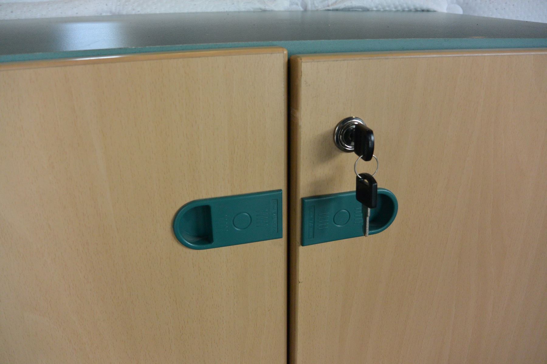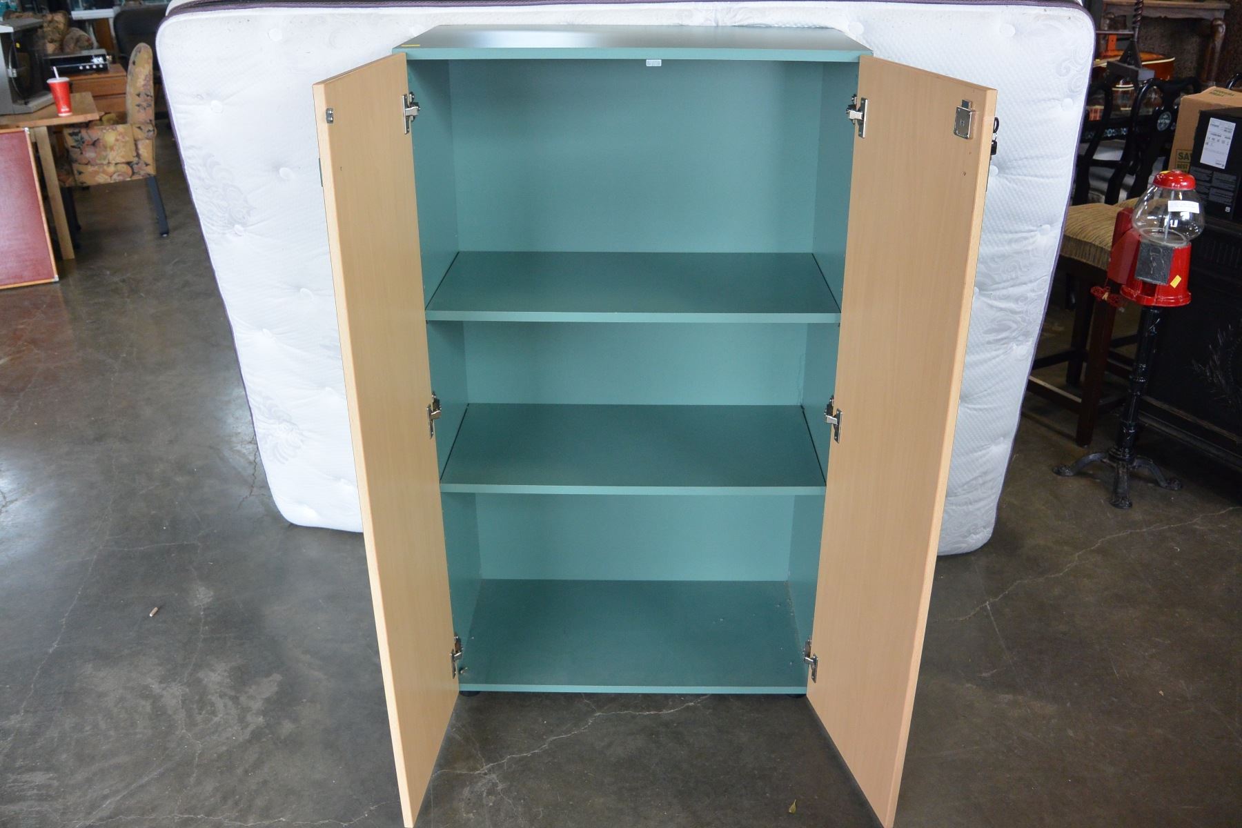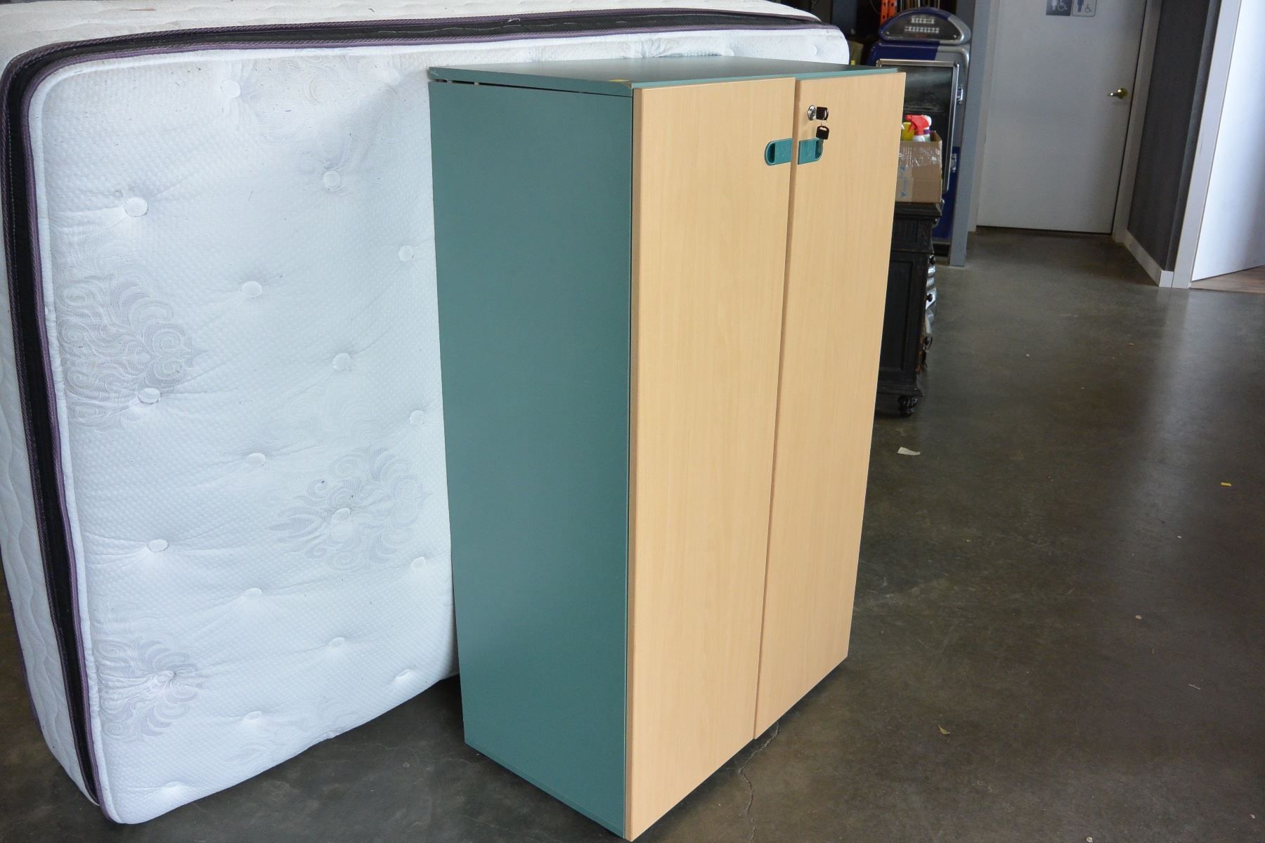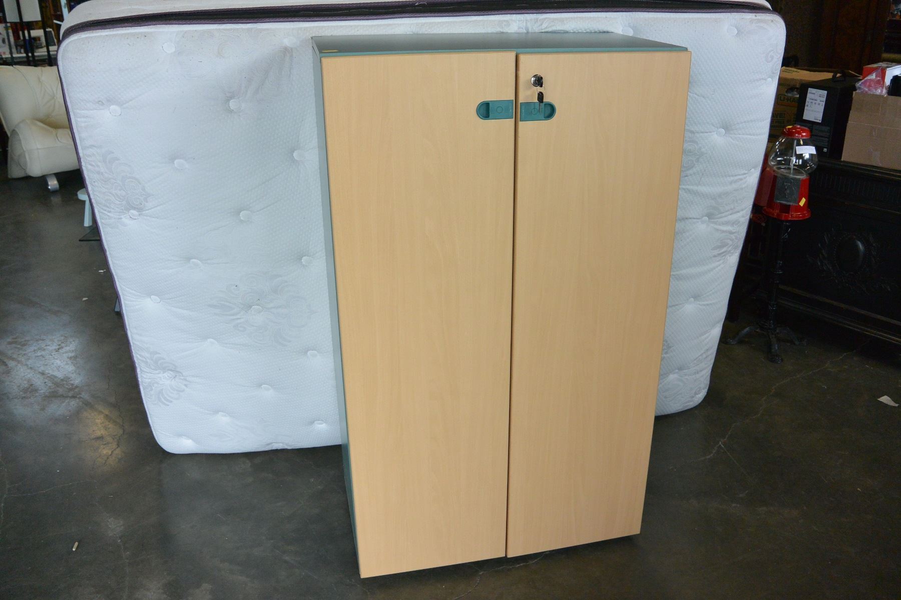 GREEN AND MAPLE 2 DOOR CABINET WITH KEYS