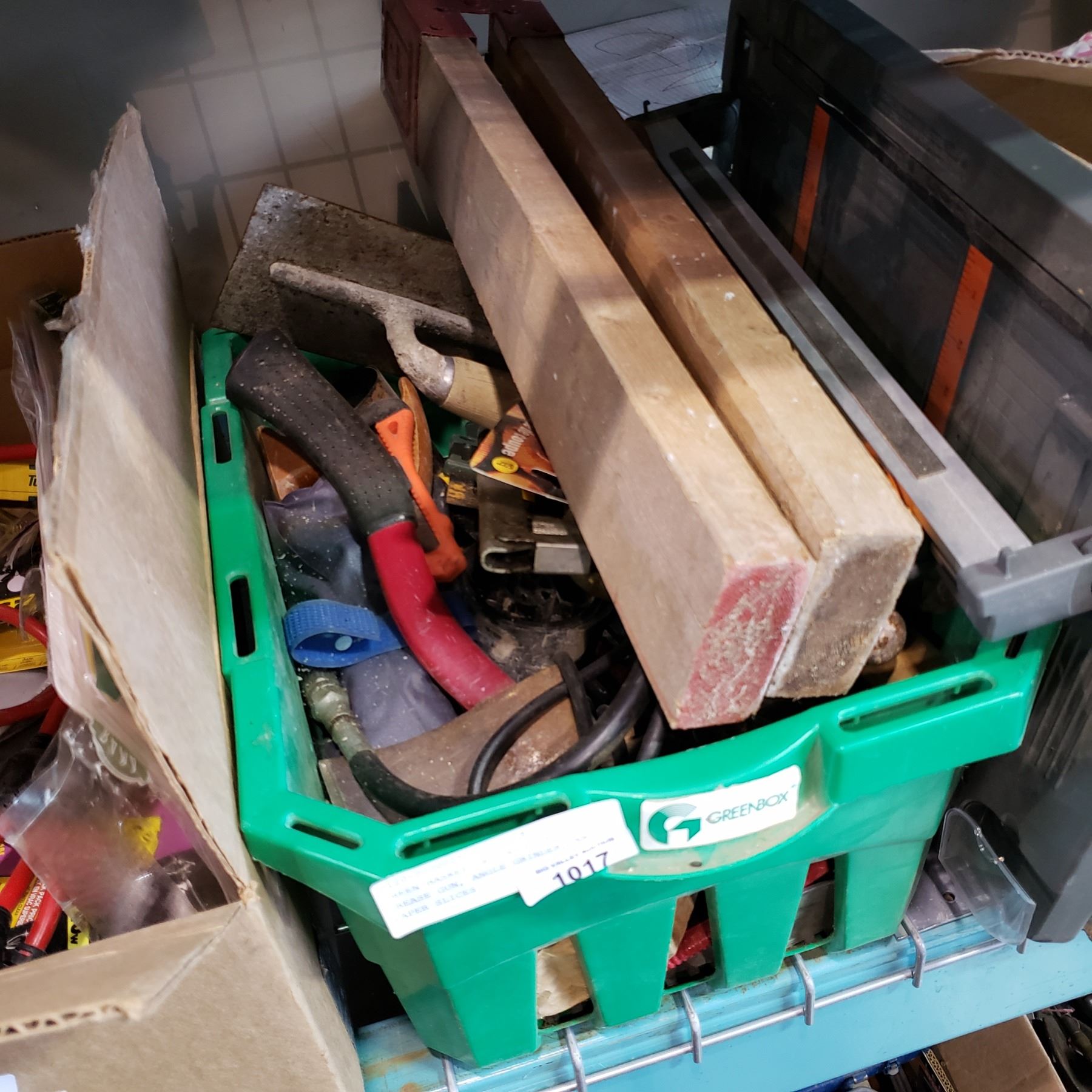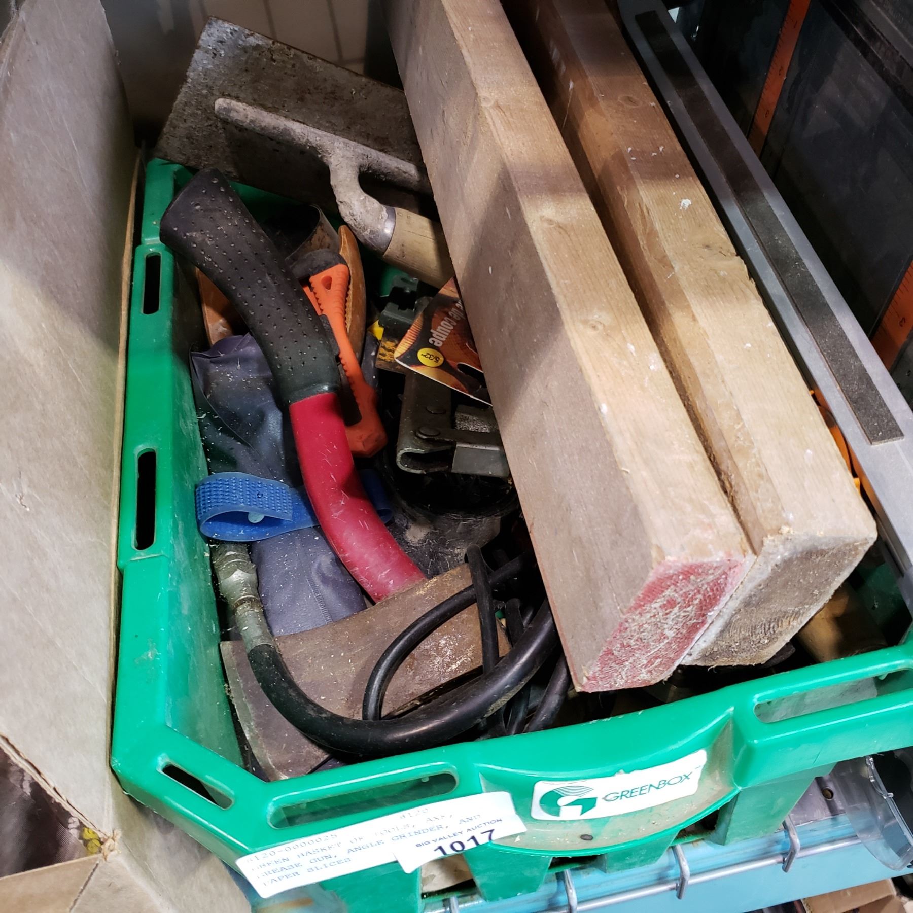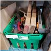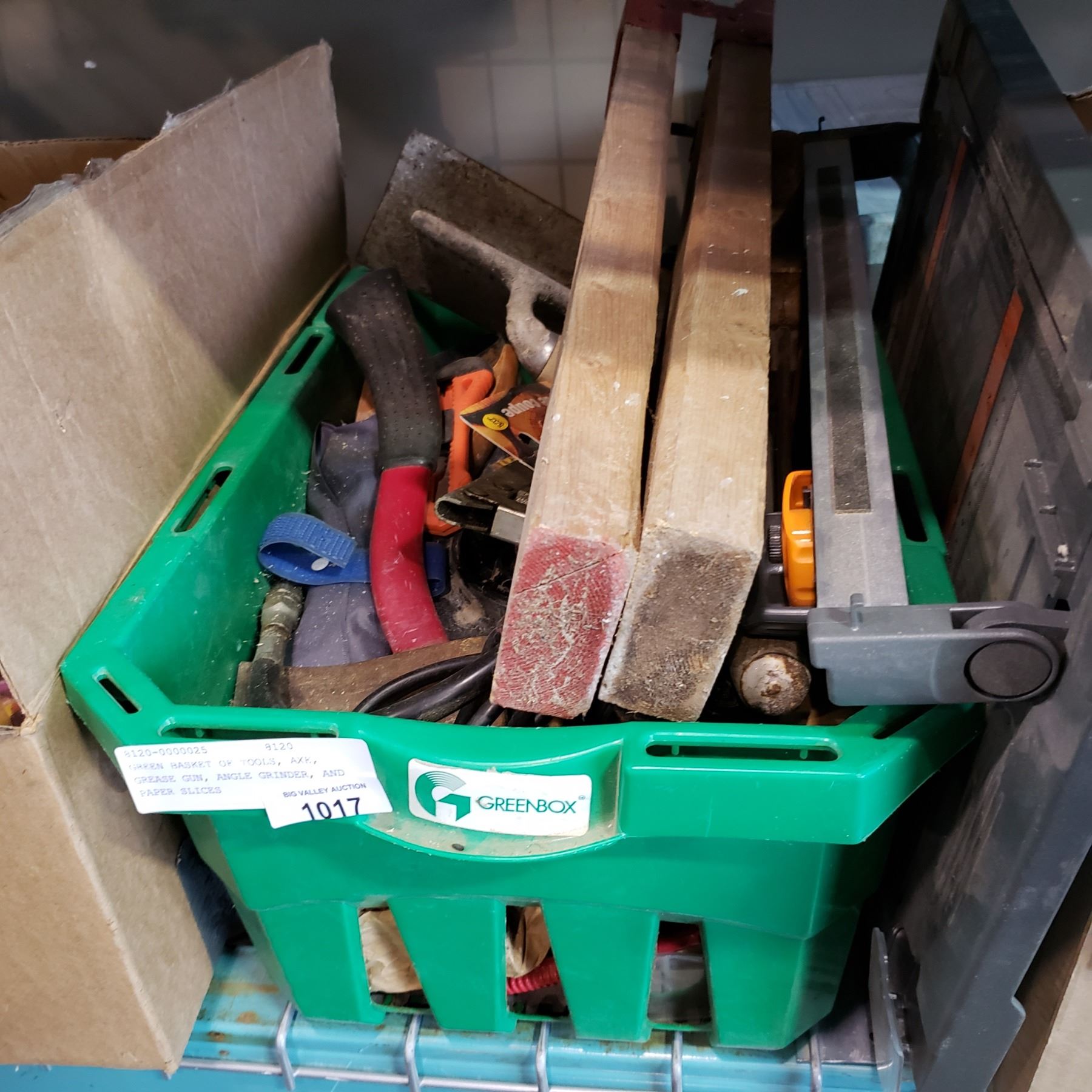 GREEN BASKET OF TOOLS, AXE, GREASE GUN, ANGLE GRINDER, AND PAPER SLICES