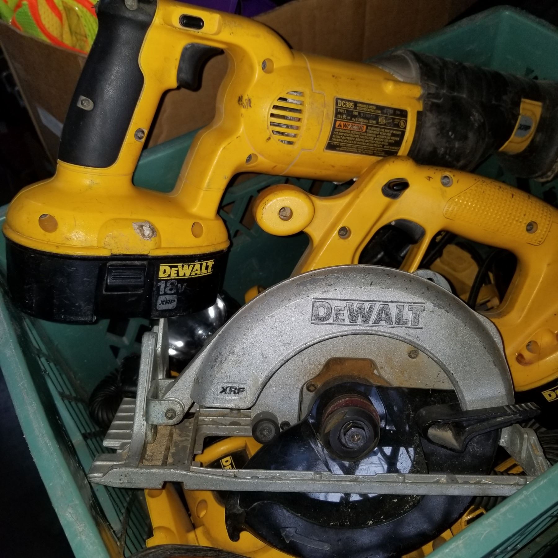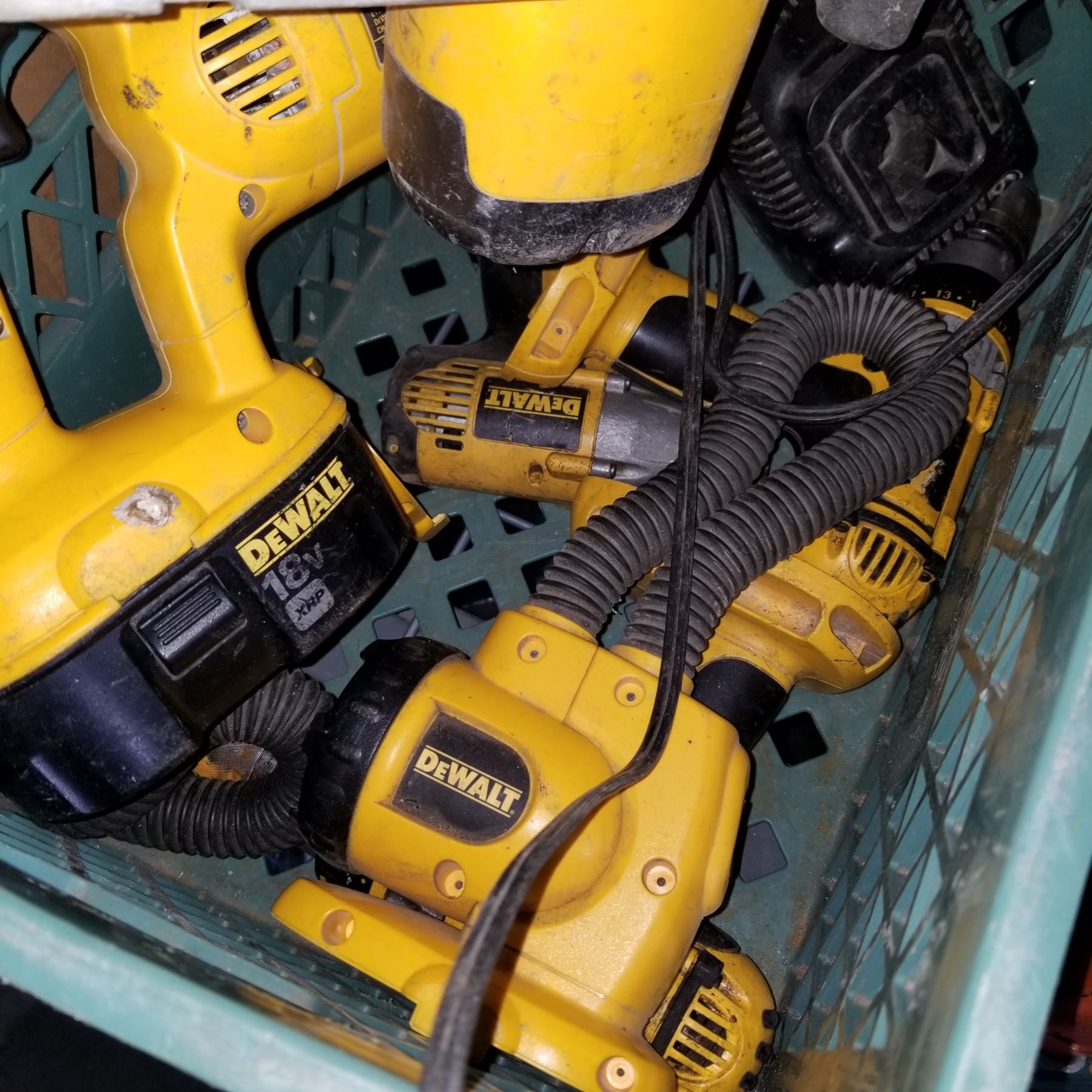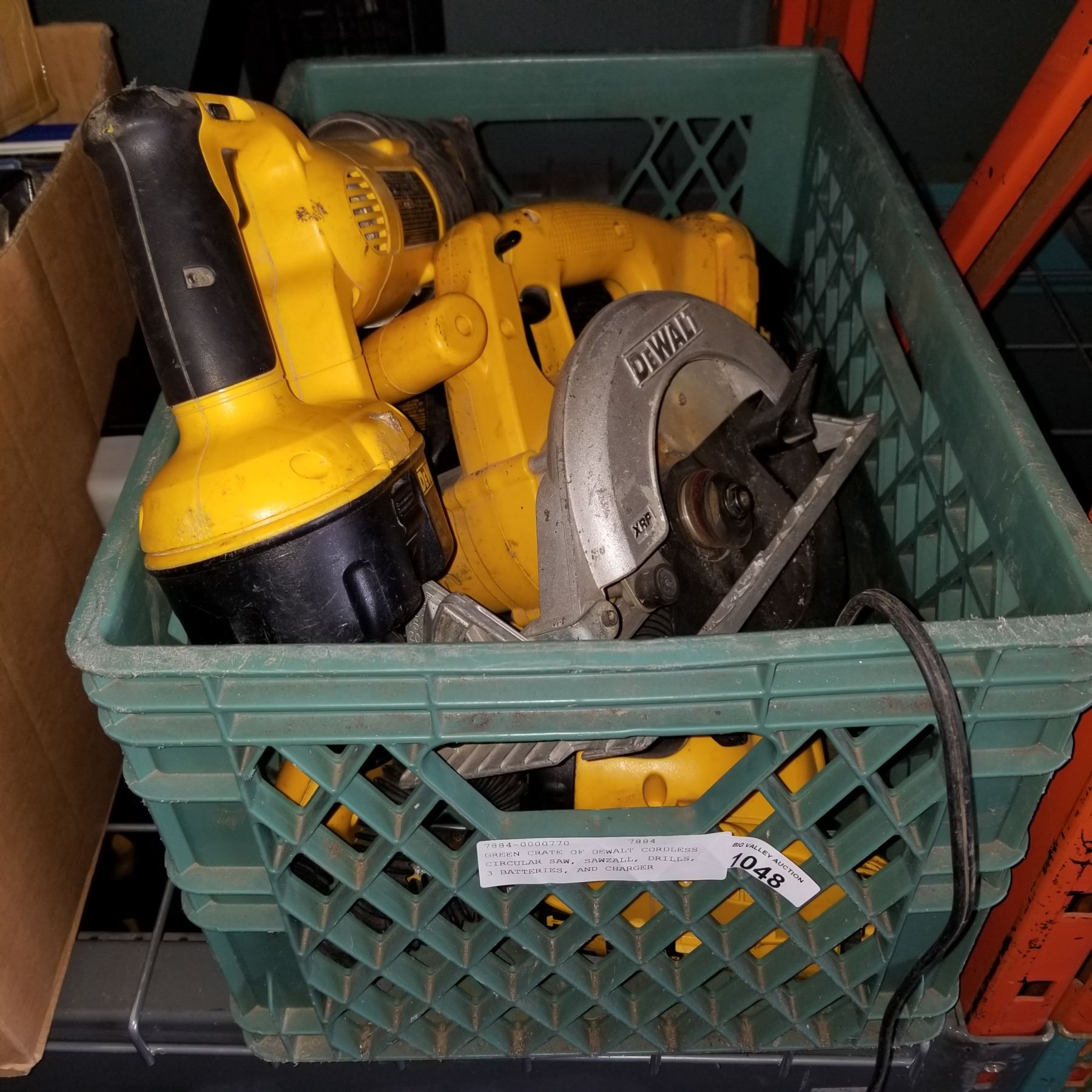 GREEN CRATE OF DEWALT CORDLESS CIRCULAR SAW, SAWZALL, DRILLS, 3 BATTERIES, AND CHARGER