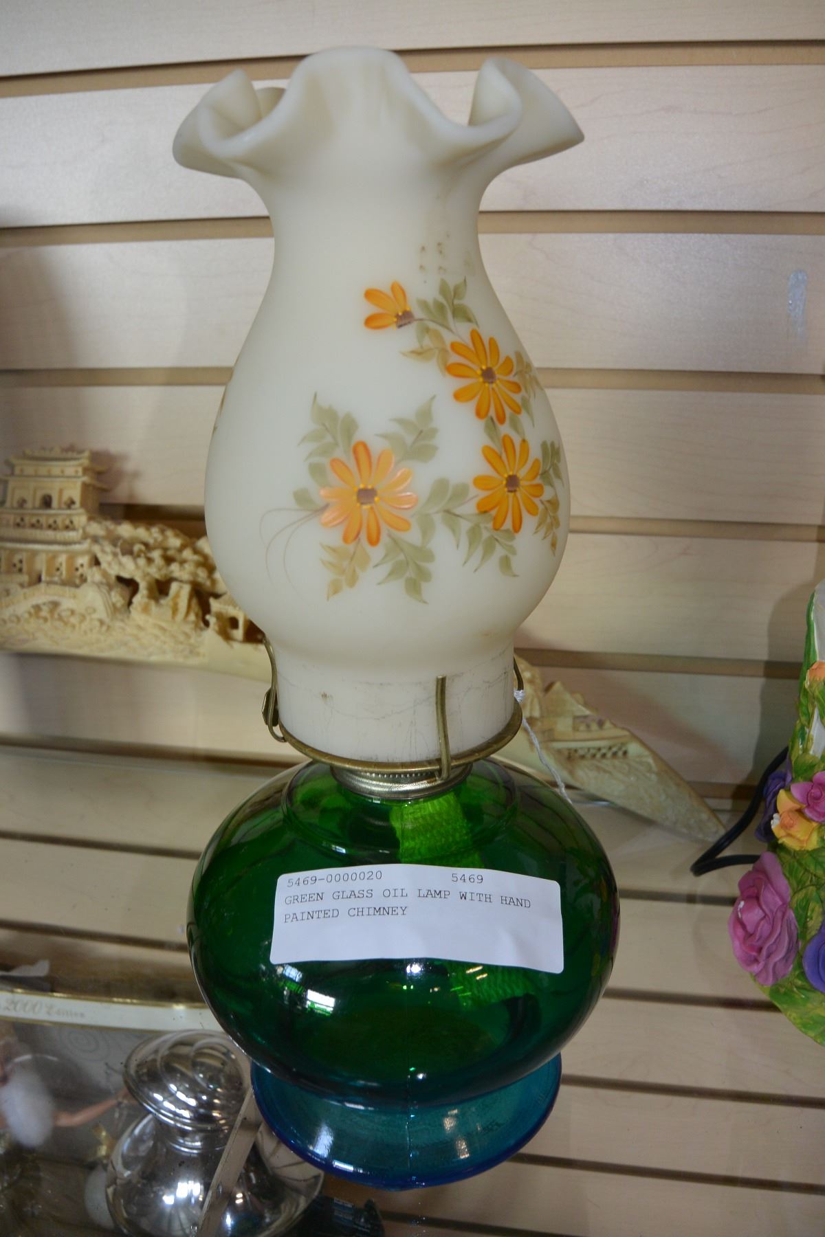 GREEN GLASS OIL LAMP WITH HAND PAINTED CHIMNEY