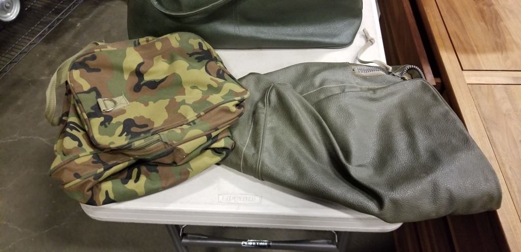 GREEN HANDBAG AND CAMO DUFFLE BAG