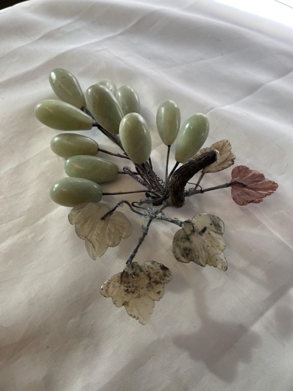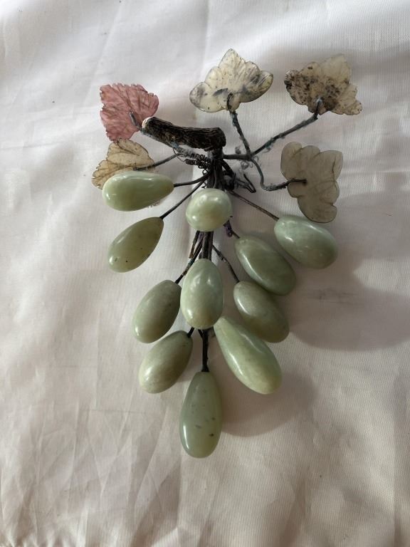 GREEN JADE GRAPES AND SEI PRECIOUS STONE LEAVES ORNAMENT, HAND CARVED