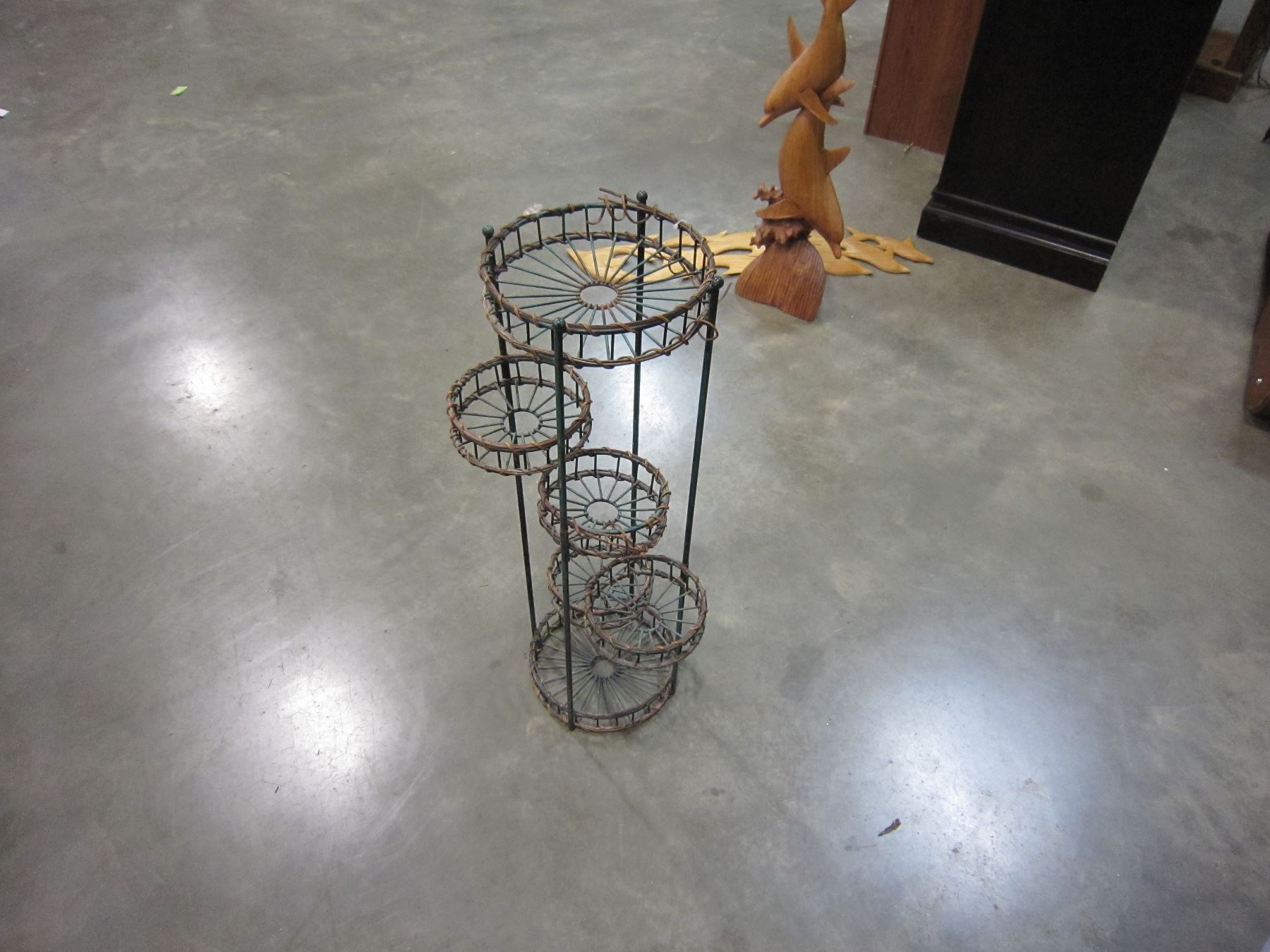 GREEN METAL AND RATTAN RETRACTABLE ARM PLANT STAND