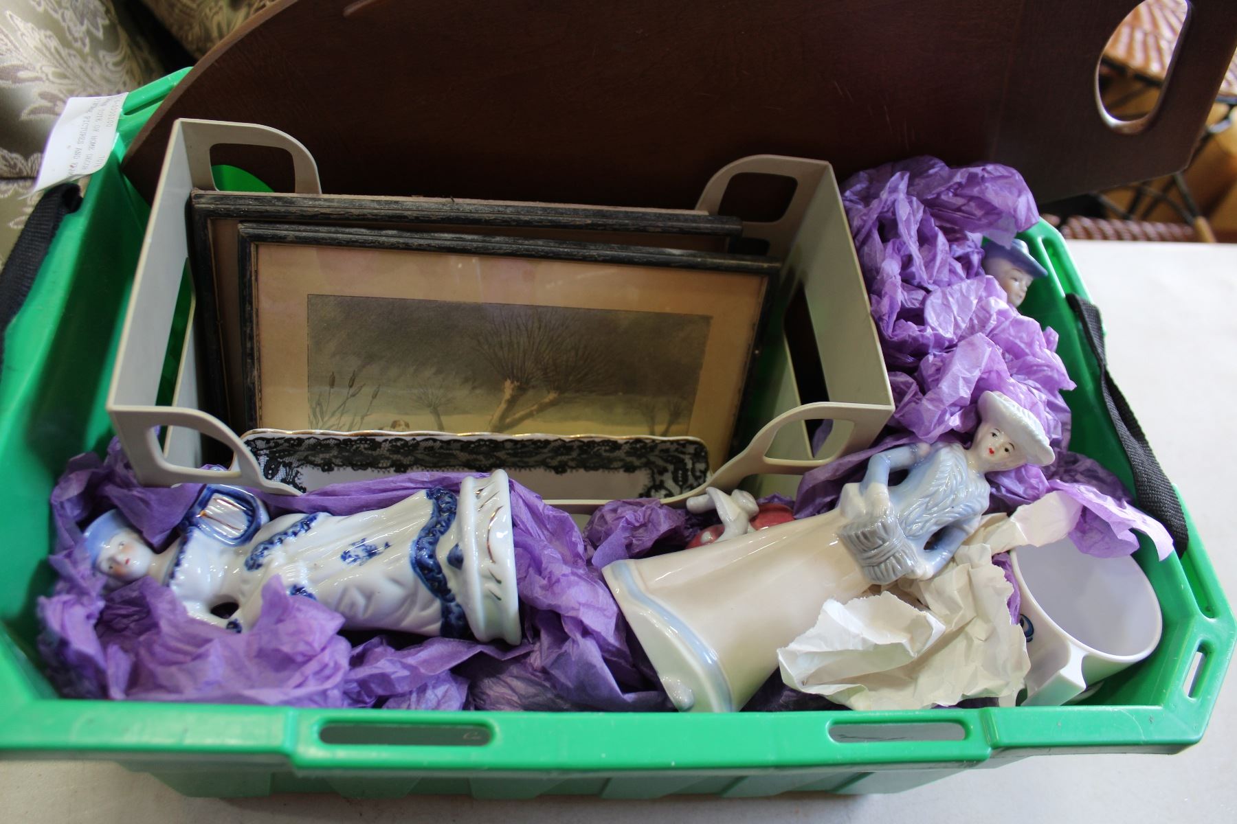 GREEN TOTE OF HOME DECOR AND VINTAGE PICTURES AND FRAMES