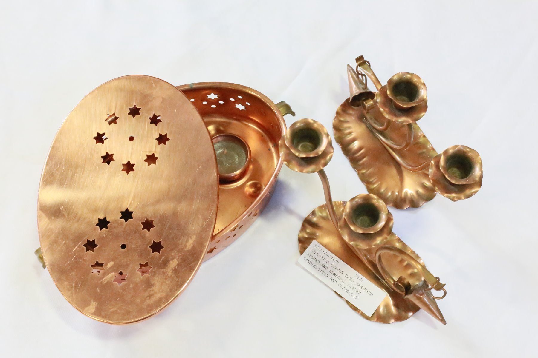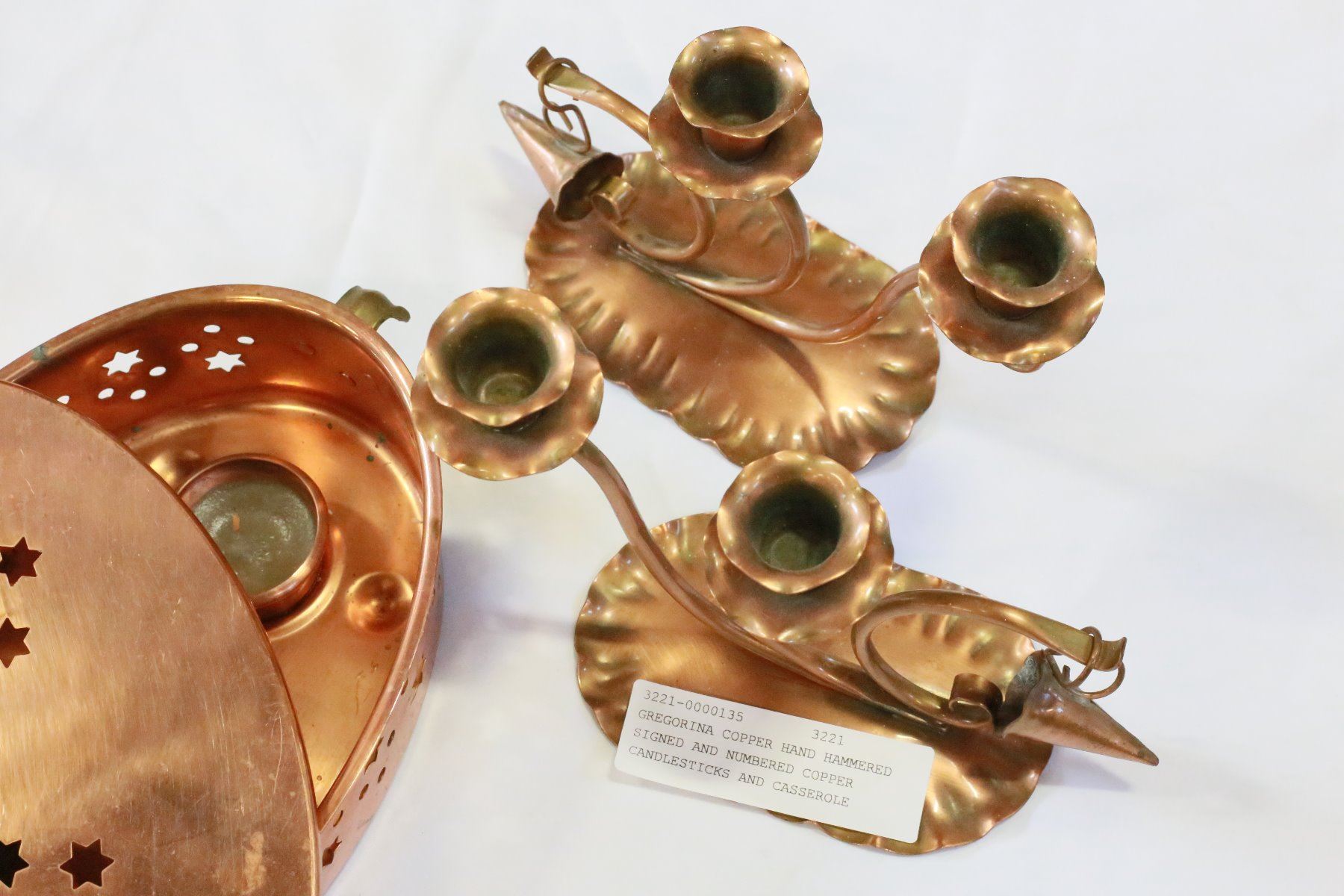 GREGORINA COPPER HAND HAMMERED SIGNED AND NUMBERED COPPER CANDLESTICKS AND CASSEROLE WARMER