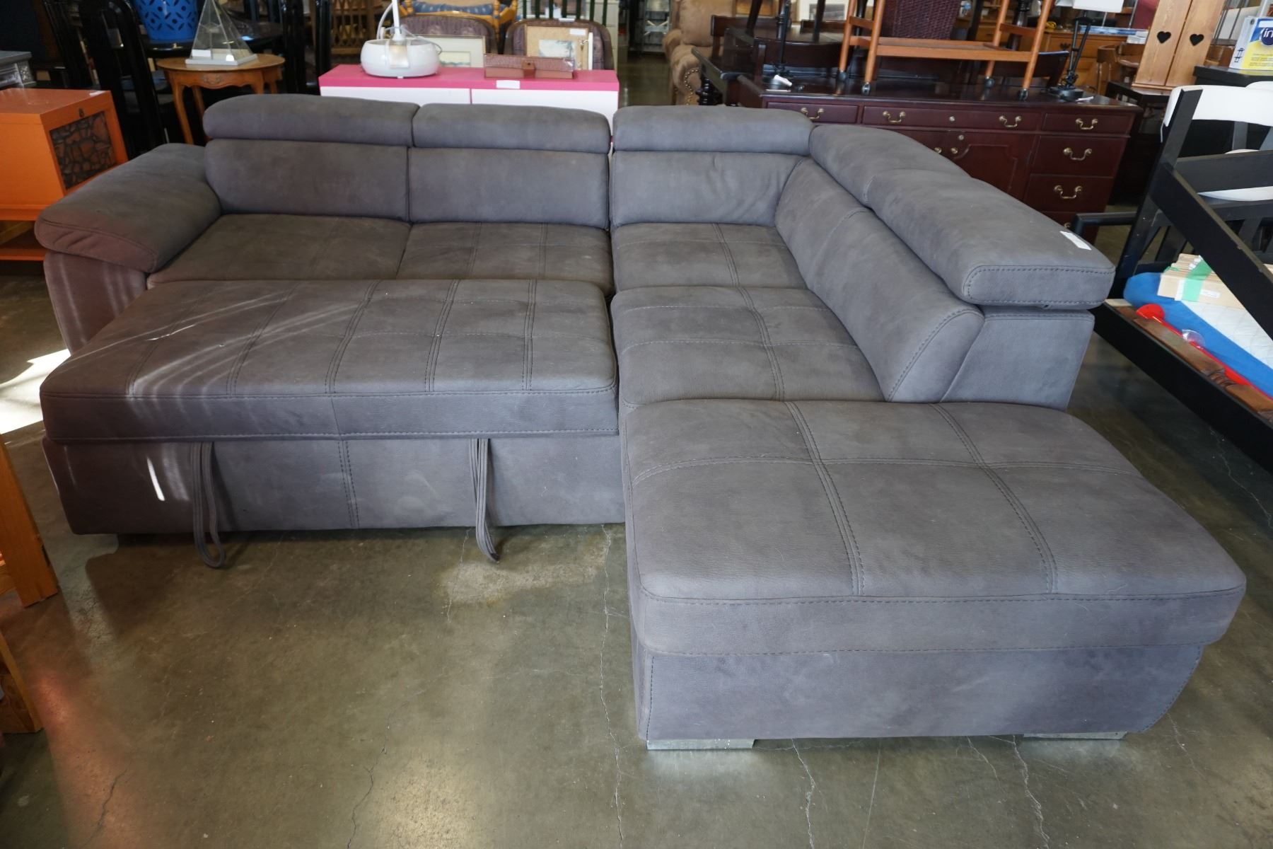 GREY MICROFIBER SECTIONAL WITH PULLOUT SECTION AND OTTOMAN