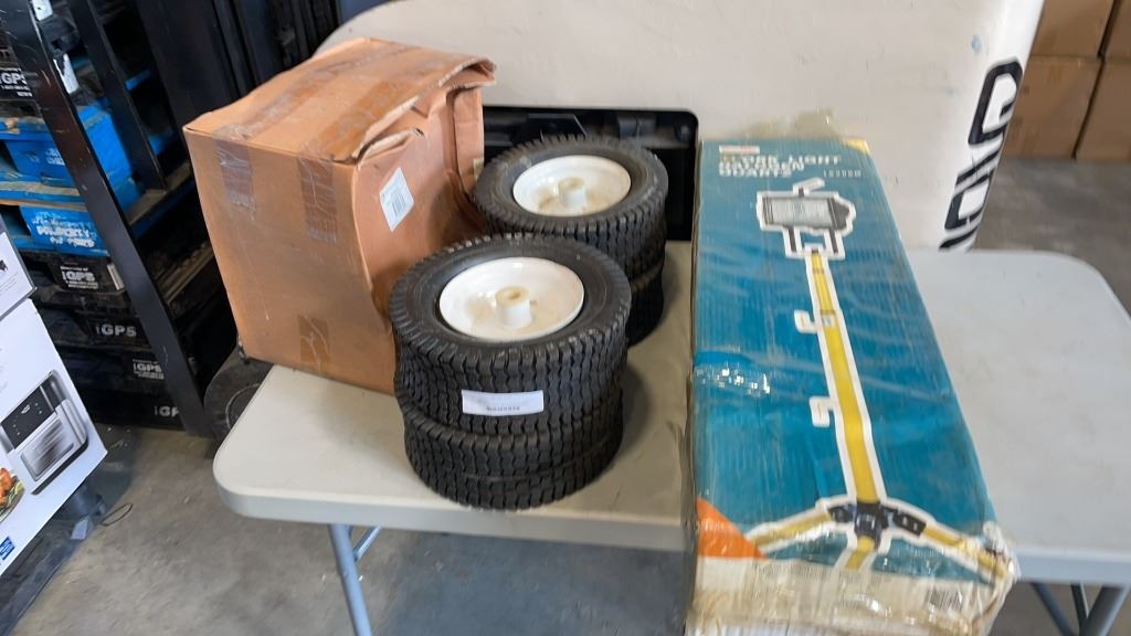 HALOGEN WORK LIGHT WITH ATLAS PAGING HORN AND 4 CART WHEELS