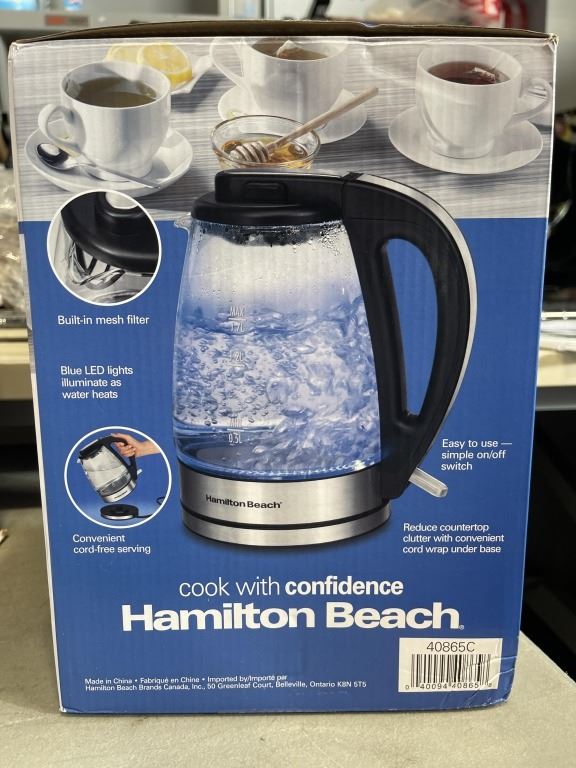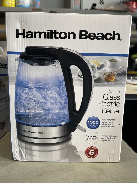 HAMILTON BEACH 1.7L GLASS ELECTRIC KETTLE - TESTED WORKING, RETAIL $59