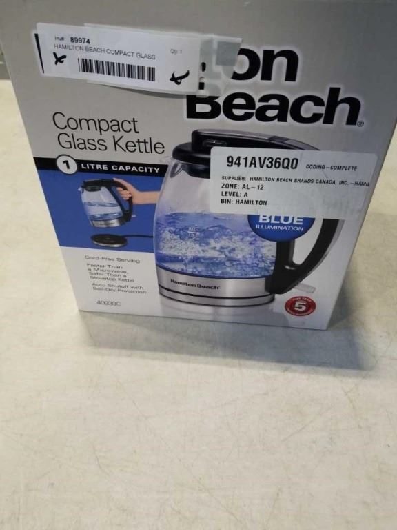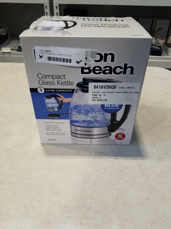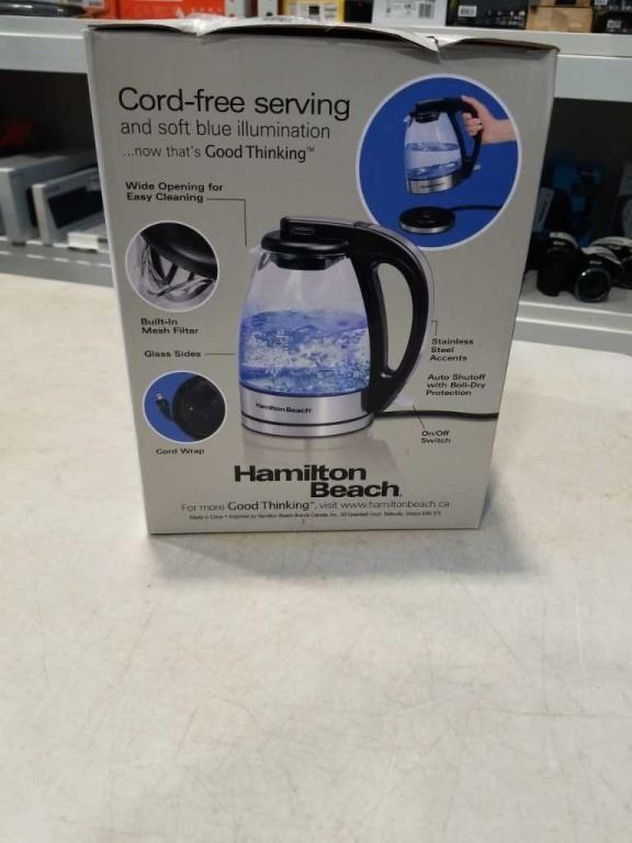 HAMILTON BEACH COMPACT GLASS ELECTRIC KETTLE TESTED AND WORKING - RETAIL $49