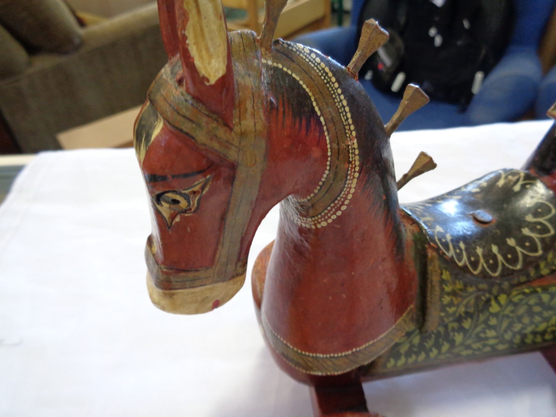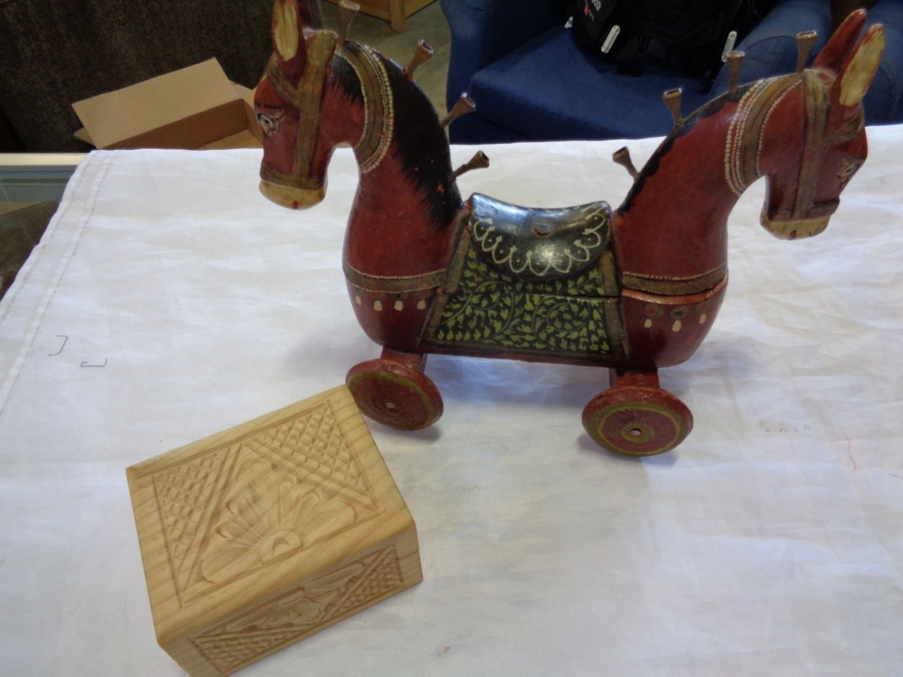 HAND CARVED FOLKLORE HORSE WAGON AND HAND CARVED BOX W/ CONTENTS