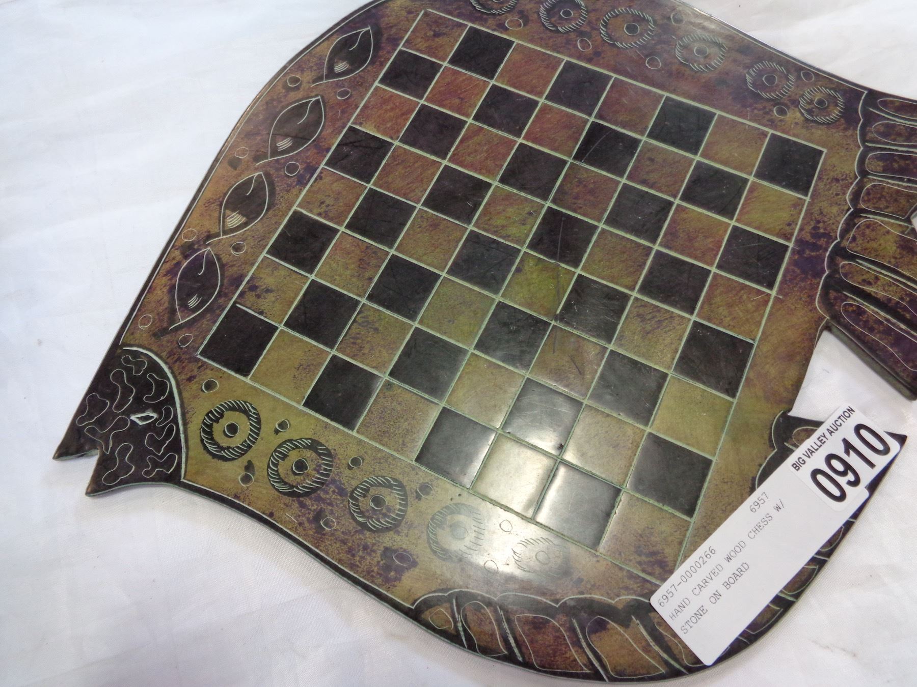 HAND CARVED WOOD CHESS PIECES W/ CARVED STONE FISH CHESS BOARD