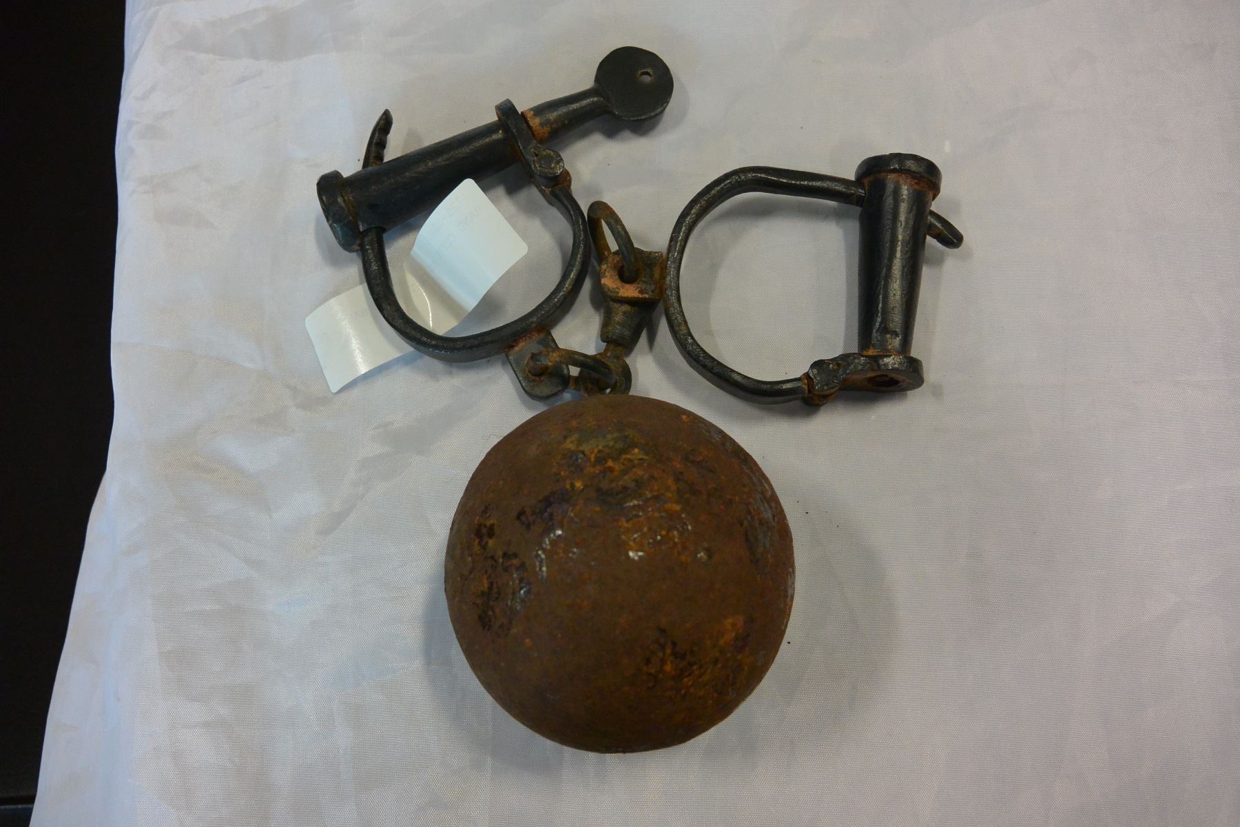 HAND CUFFS AND CAST IRON BALL