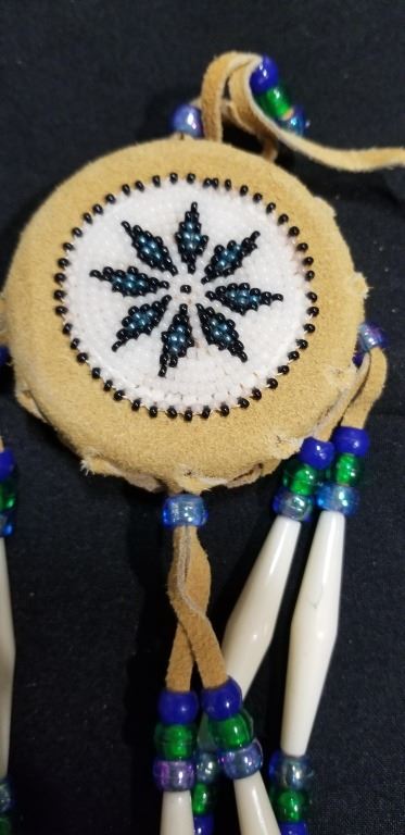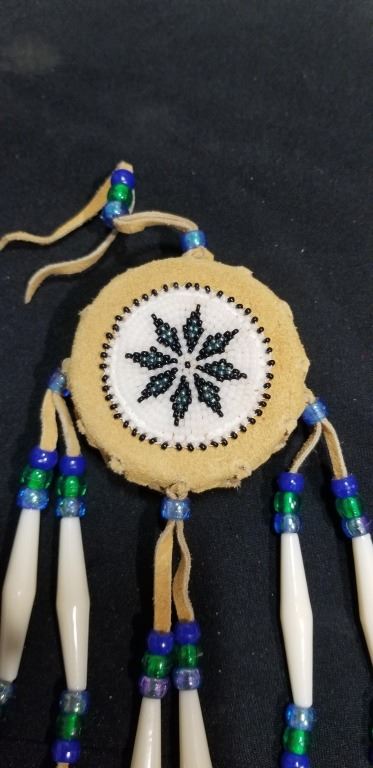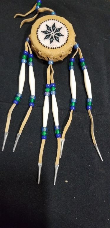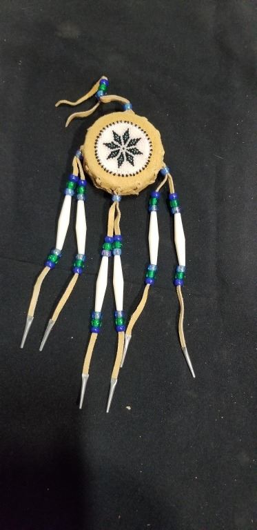 HAND MADE LEATHER BEADED DREAM CATCHER, 10 INCH LONG X 4 INCH WIDE
