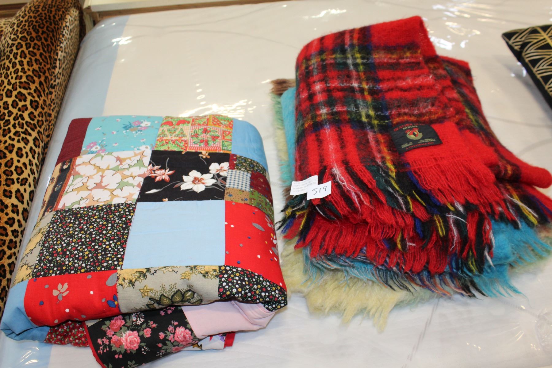 HAND MADE QUILT AND THREE MOHAIR BLANKETS MADE IN SCOTLAND