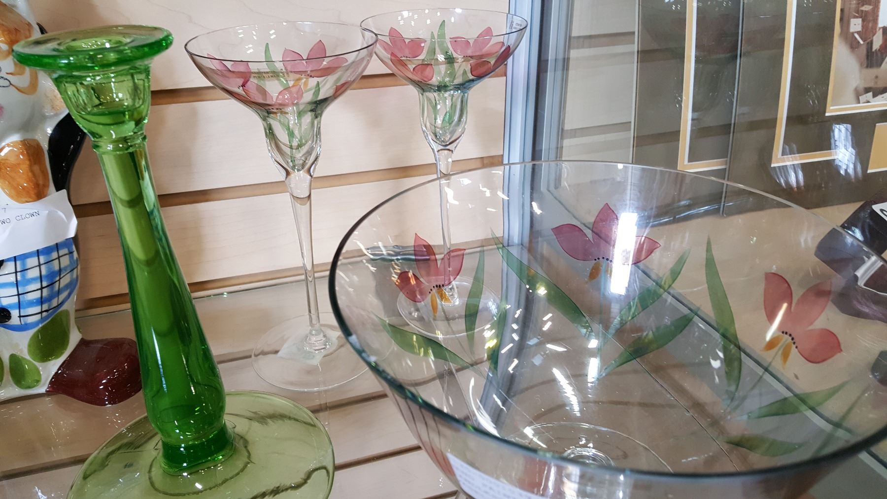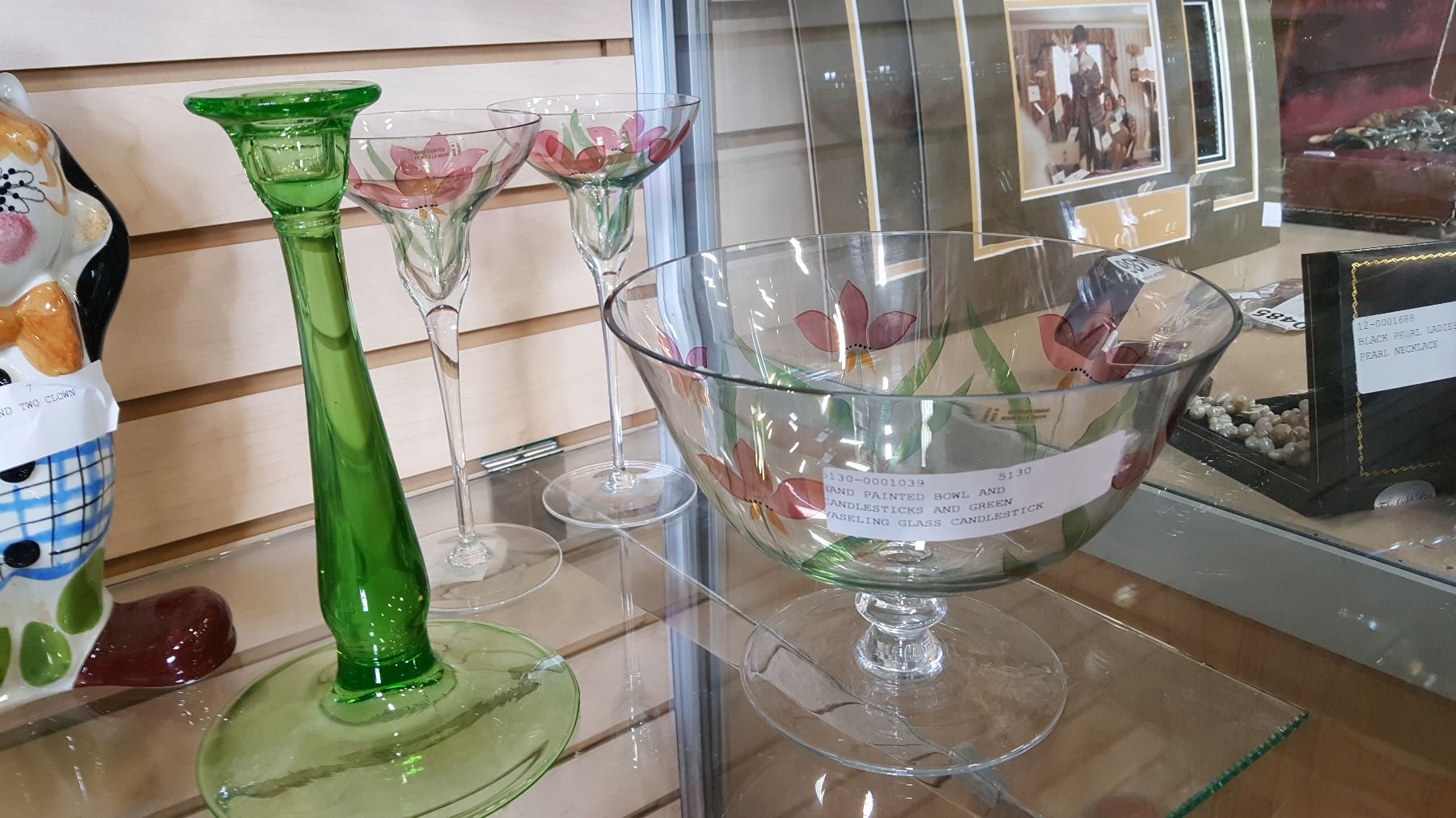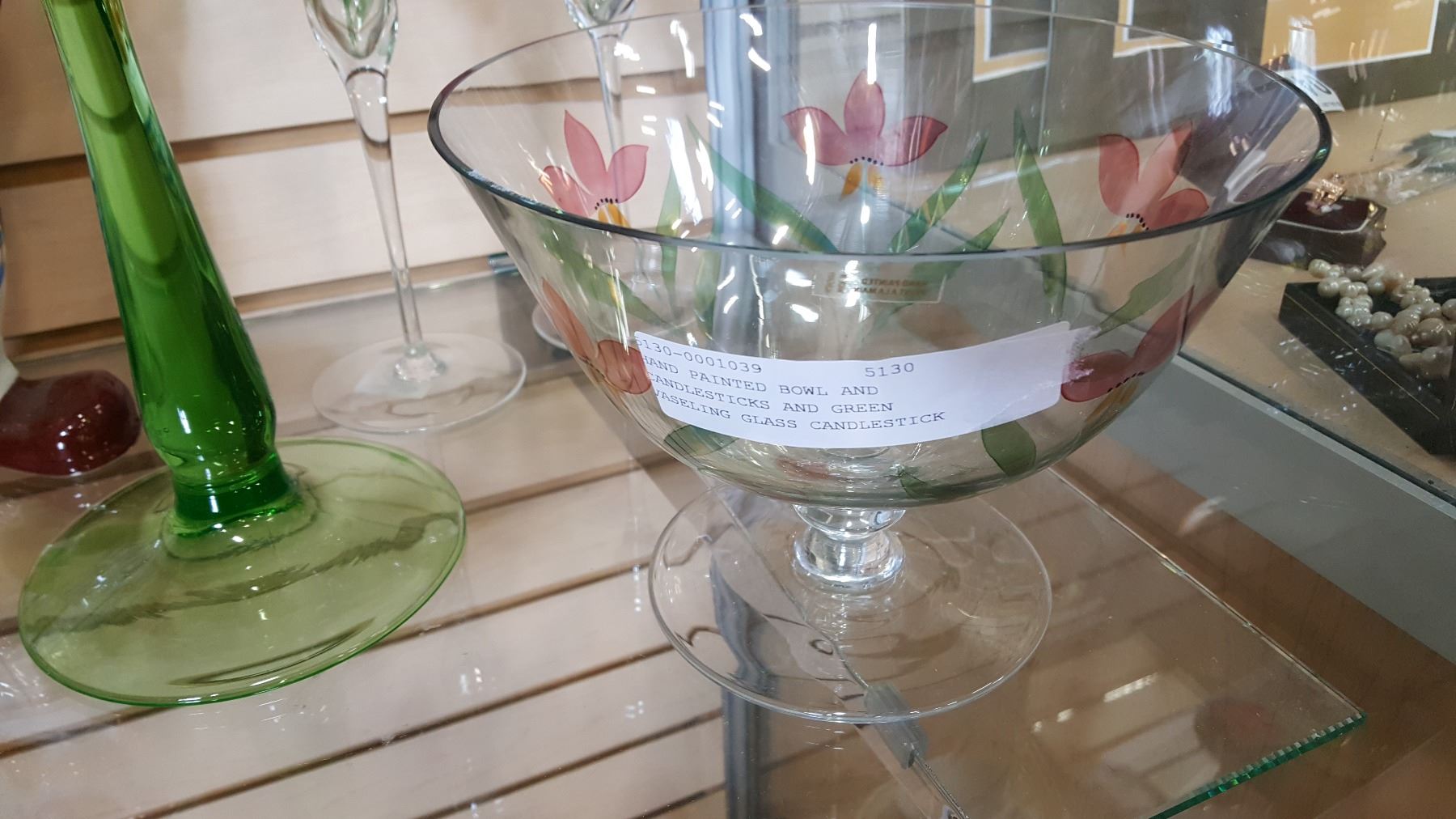 HAND PAINTED BOWL AND CANDLESTICKS AND GREEN VASELING GLASS CANDLESTICK