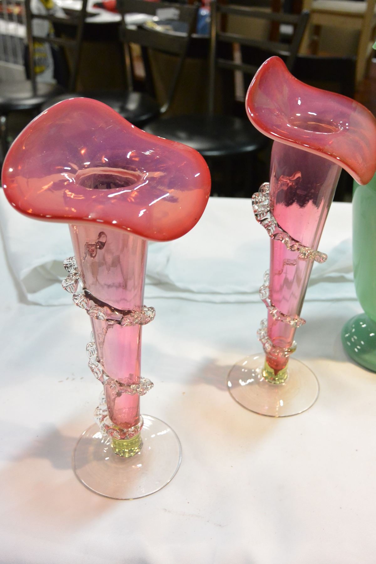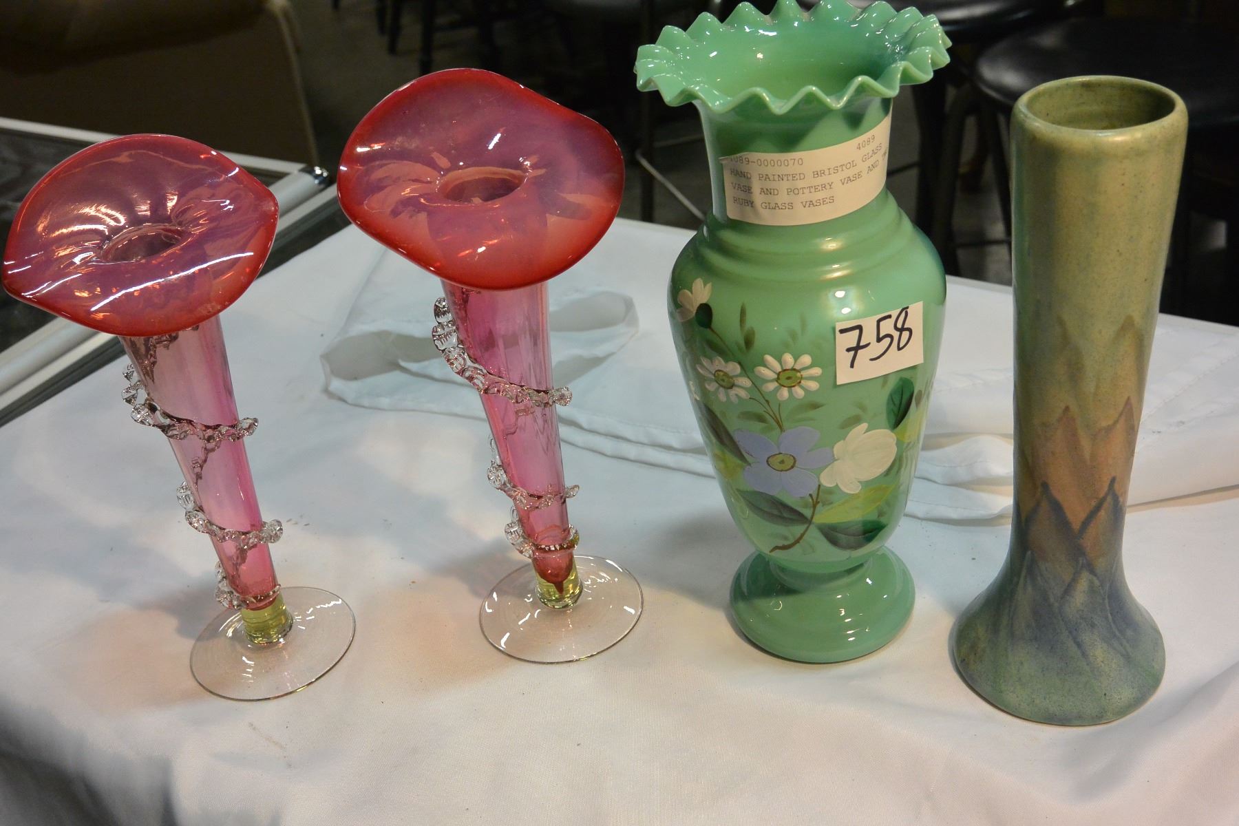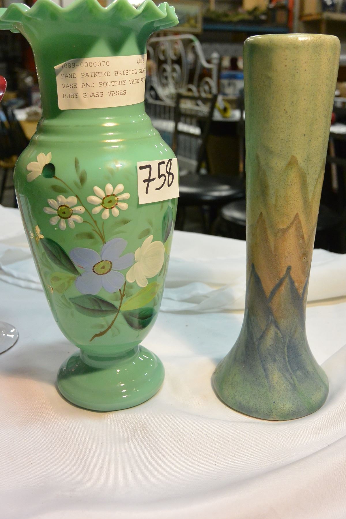 HAND PAINTED BRISTOL GLASS VASE AND POTTERY VASE AND TWO RUBY GLASS VASES