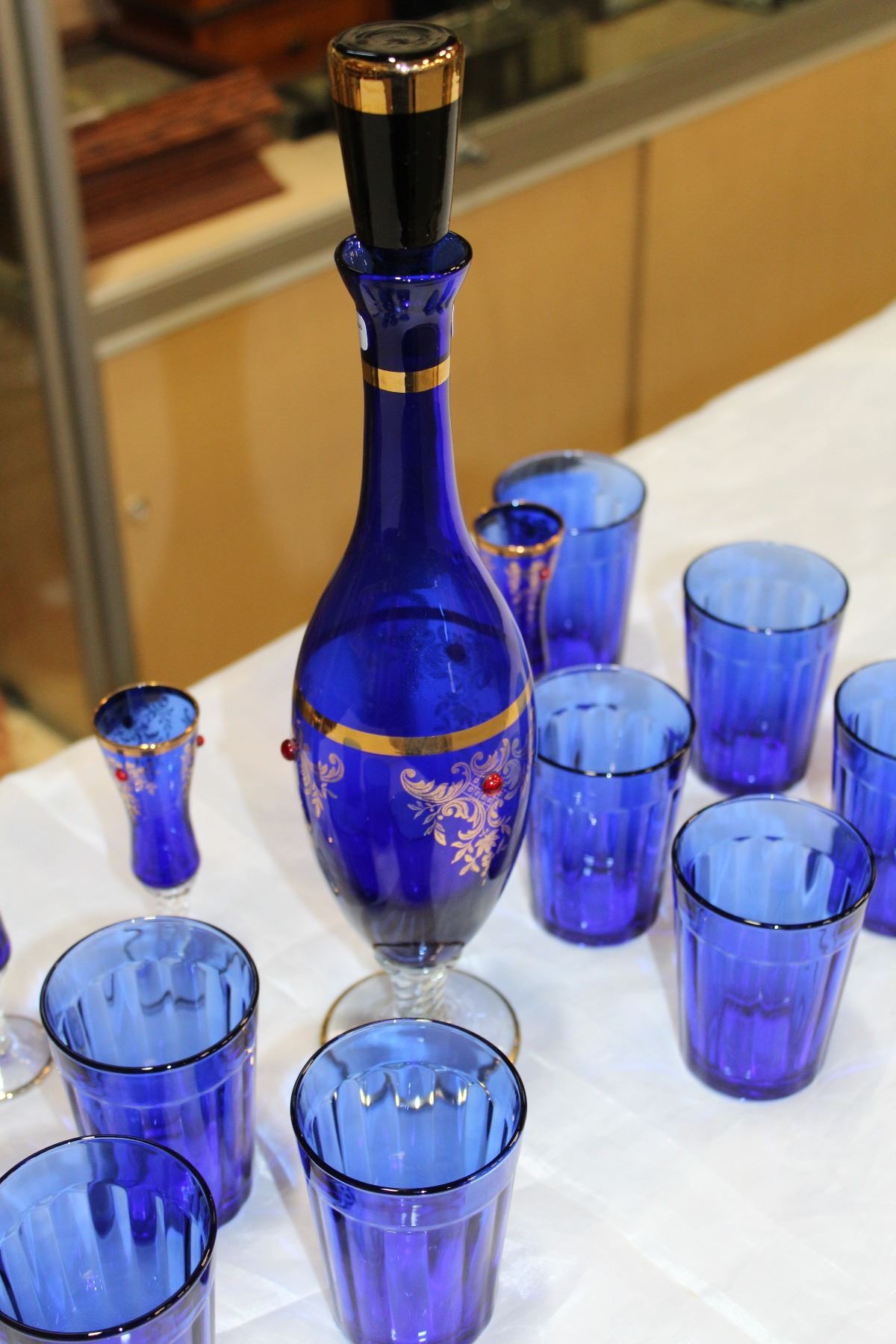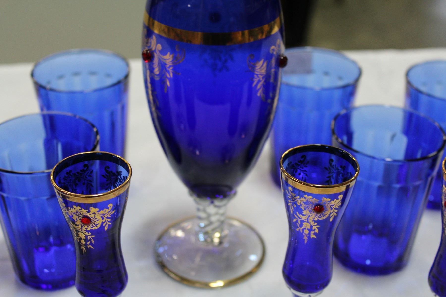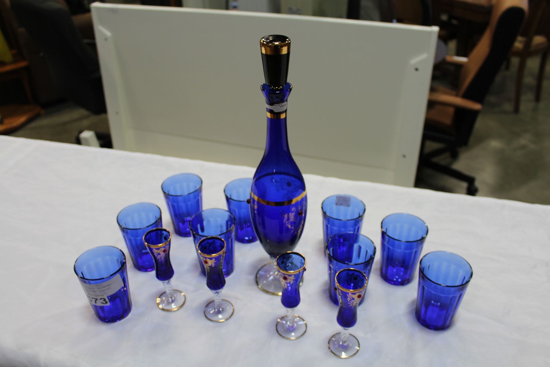 HAND PAINTED COBALT DECANTER AND COBALT DRINKING GLASSES