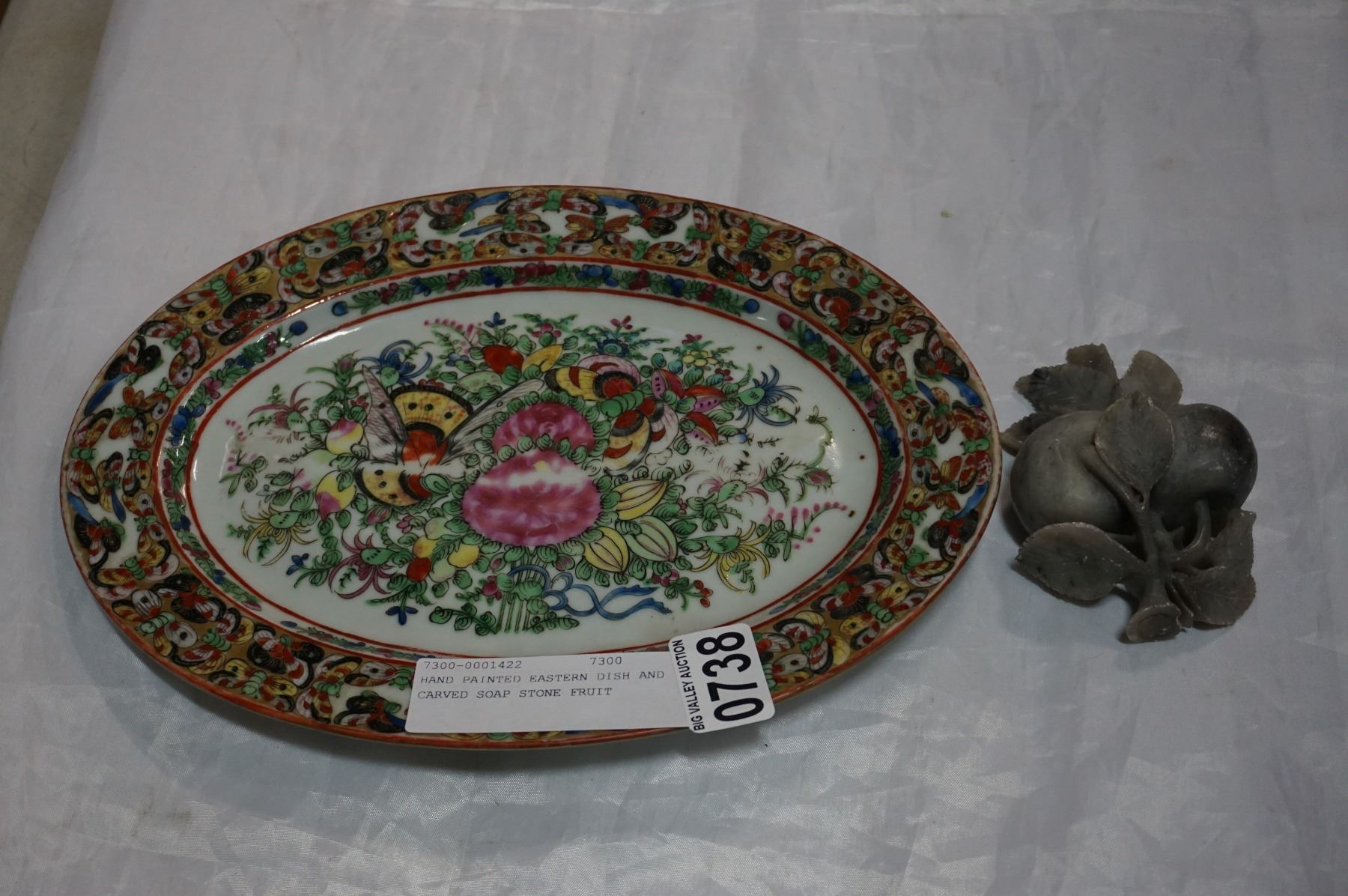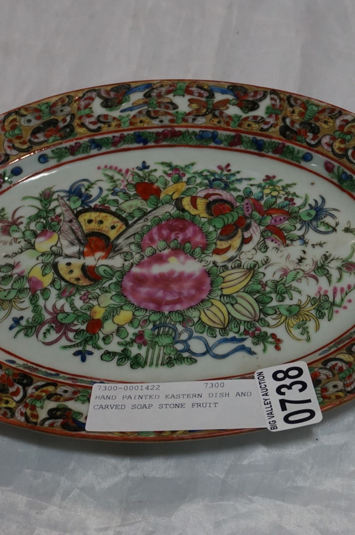 HAND PAINTED EASTERN DISH AND CARVED SOAP STONE FRUIT