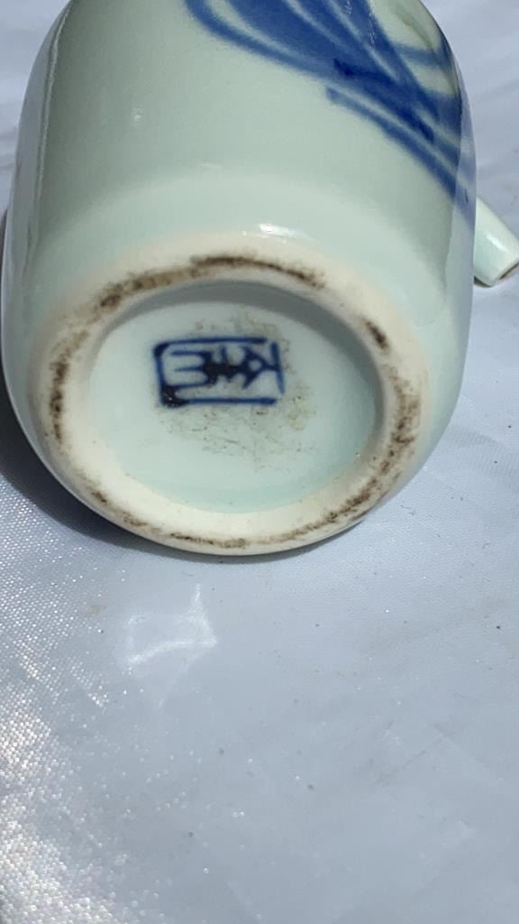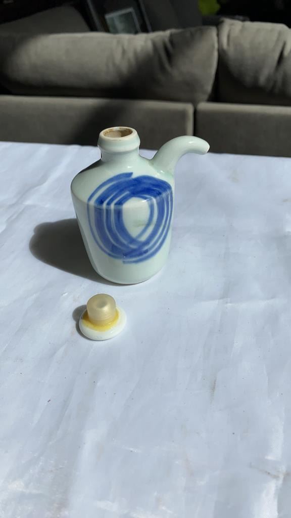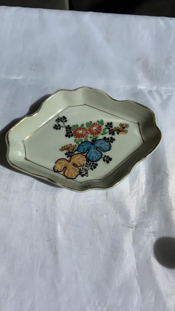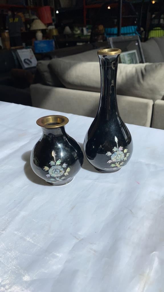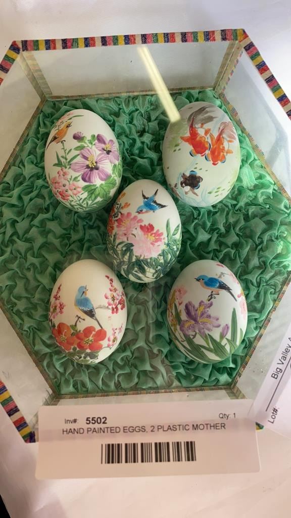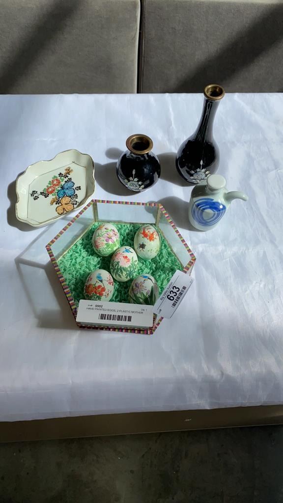 HAND PAINTED EGGS, 2 PLASTIC MOTHER OF PEARL VASES, DISH, AND VASE