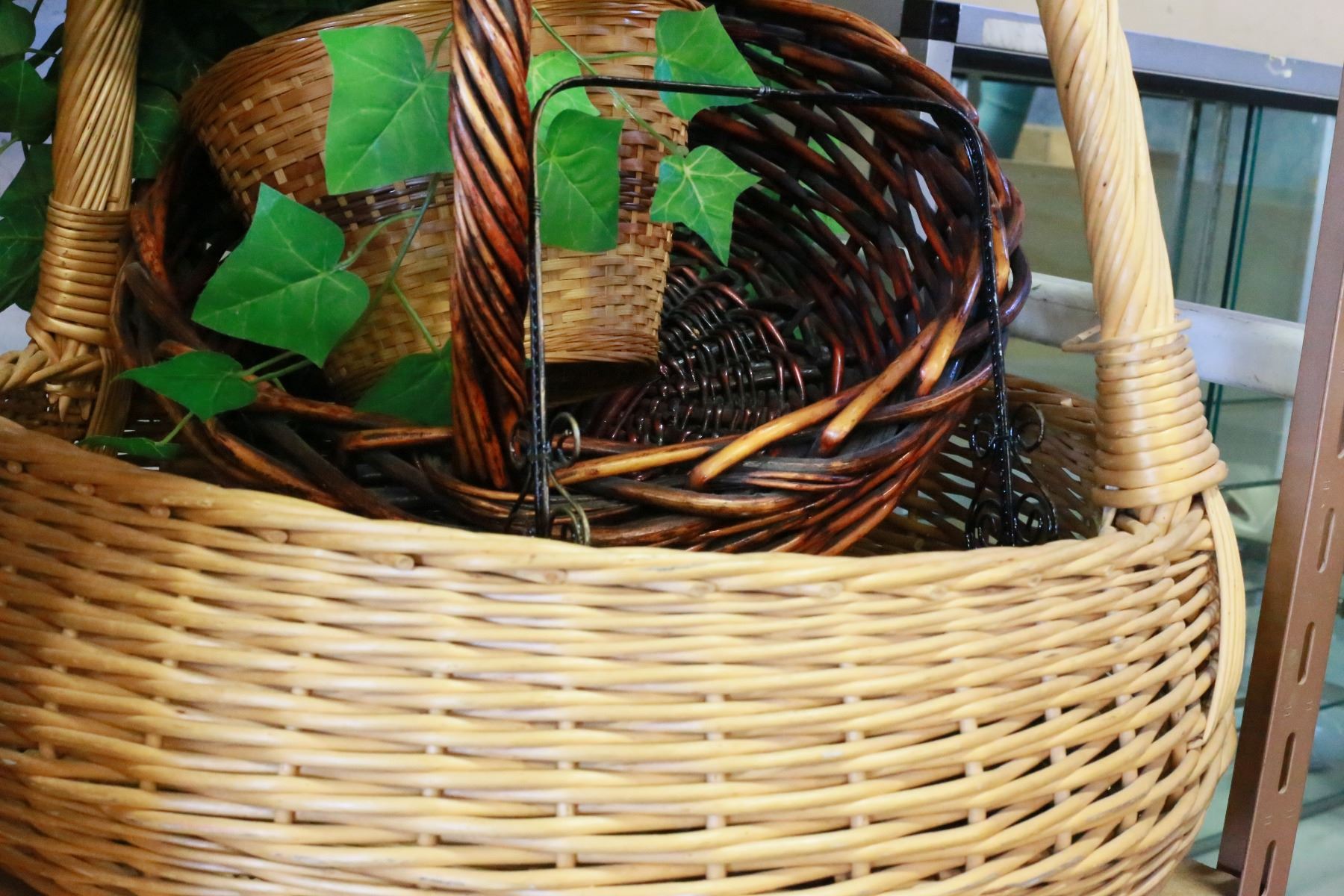 HAND WOVEN BASKET AND LOT OF WICKER BASKETS