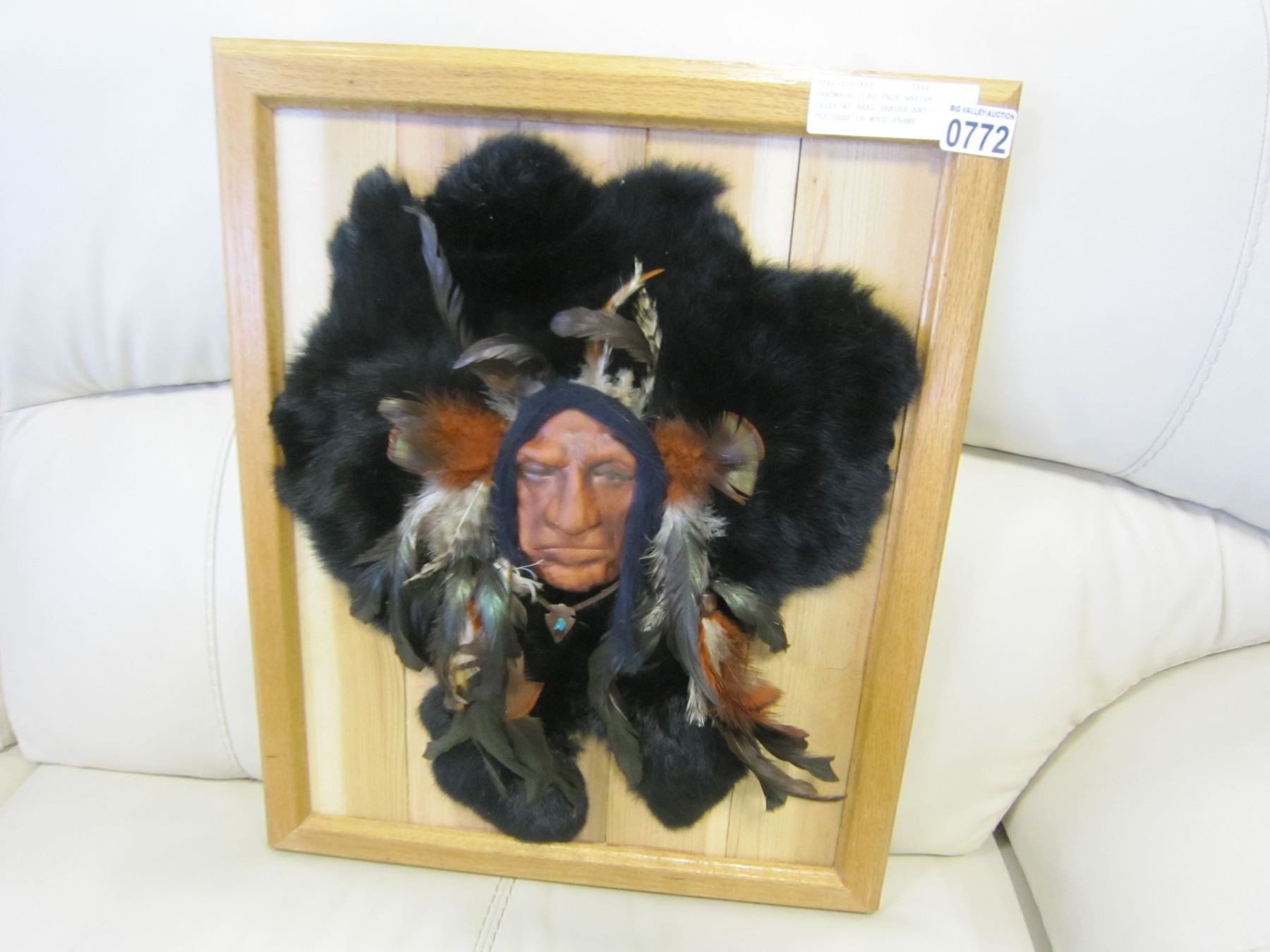 HANDMADE CLAY FACE NATIVE CHIEF W/ REAL BEAVER AND FEATHERS IN WOOD FRAME