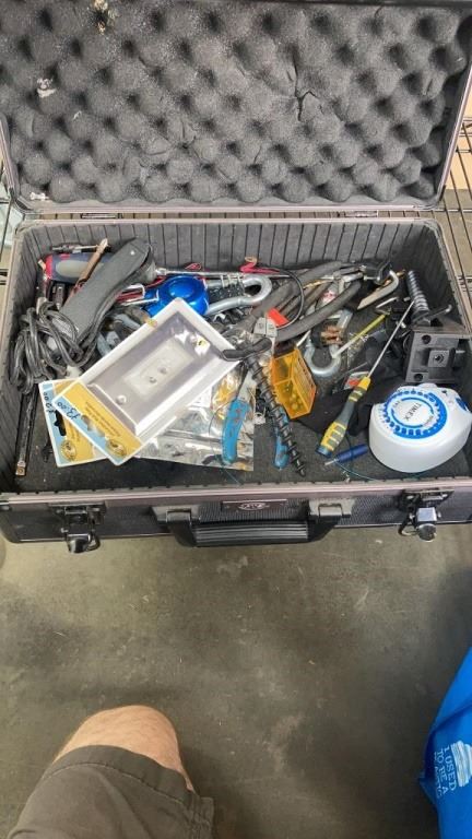 HARDCASE OF TOOLS: SOLDERING IRON, VOLCOM VOLTAGE TESTER, WIRE STRIPPER AND MORE