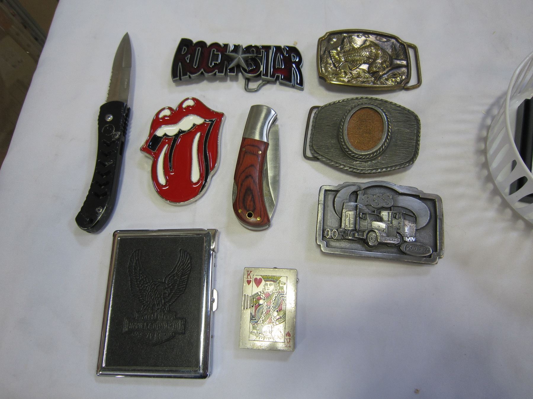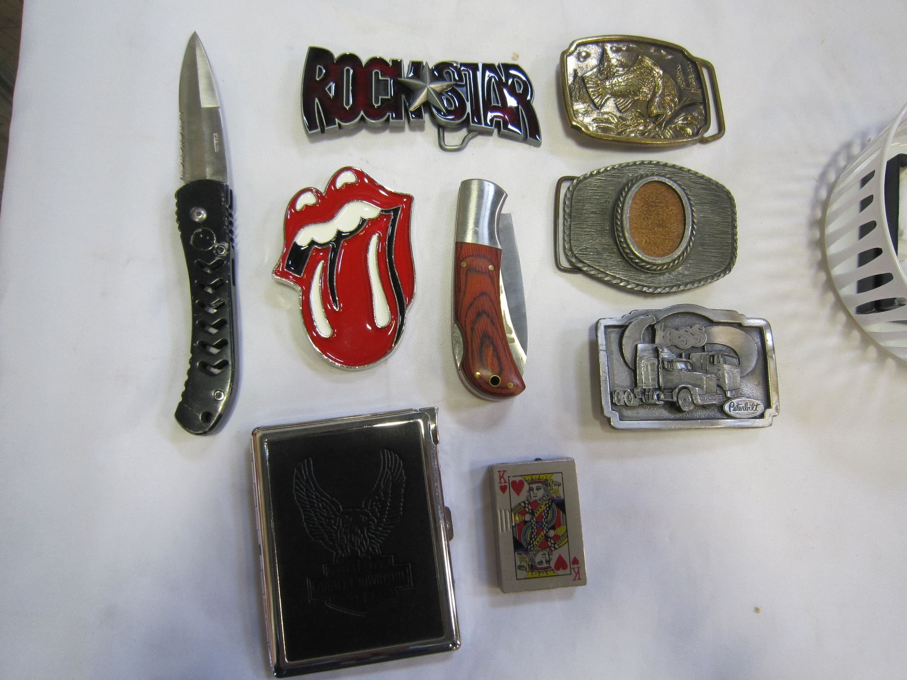HARLEY CIGARETTE CASE, LIGHTERS, BELT BUCKLES, AND KNIVES