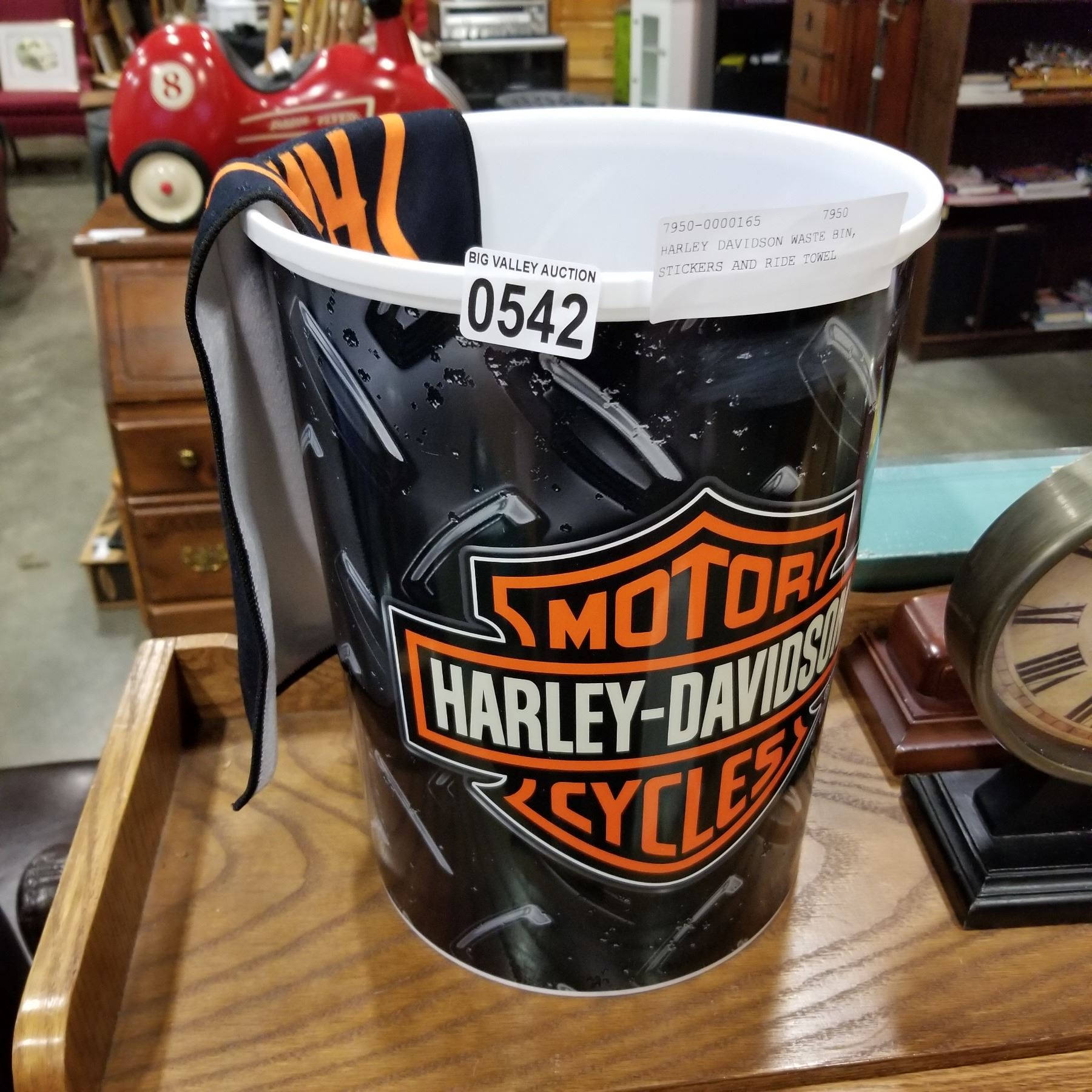 HARLEY DAVIDSON WASTE BIN, STICKERS AND RIDE TOWEL