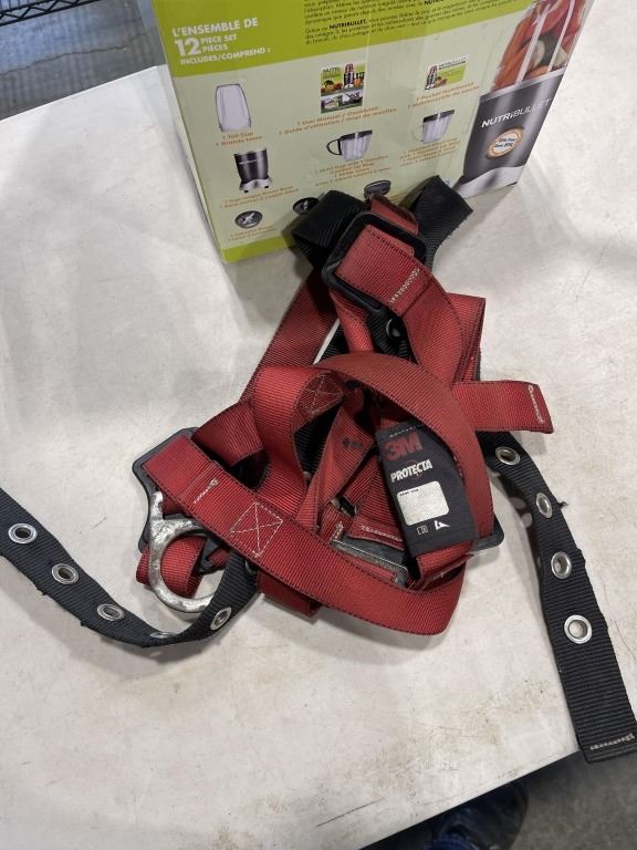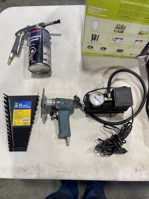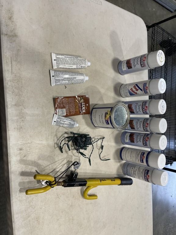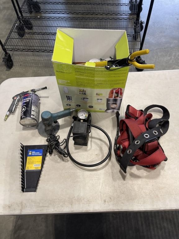 HARNESSES, GRINDER. ETC AND BOX OF WOOD FINISHING SUPPLIES