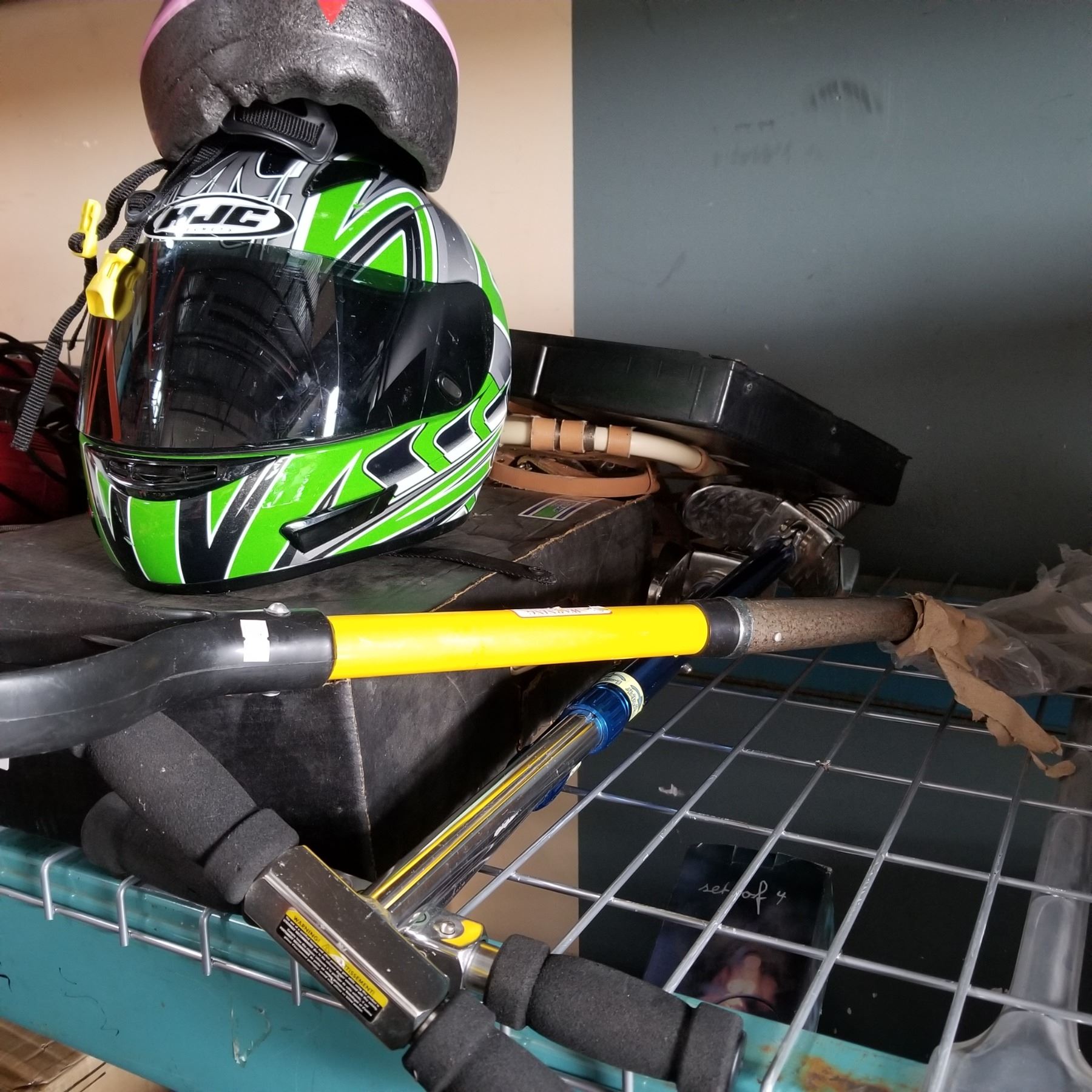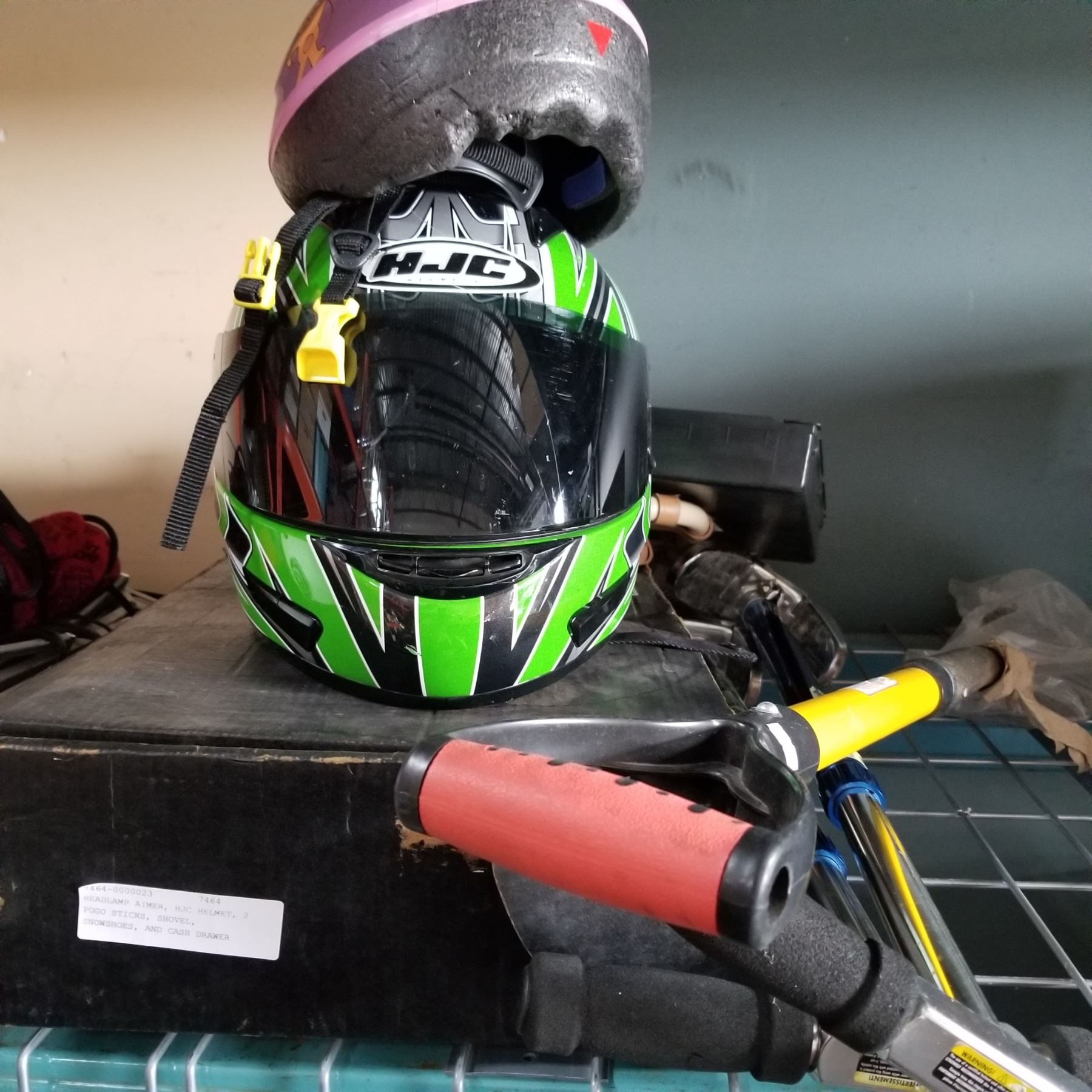 HEADLAMP AIMER, HJC HELMET, 2 POGO STICKS, SHOVEL, SNOWSHOES, AND CASH DRAWER