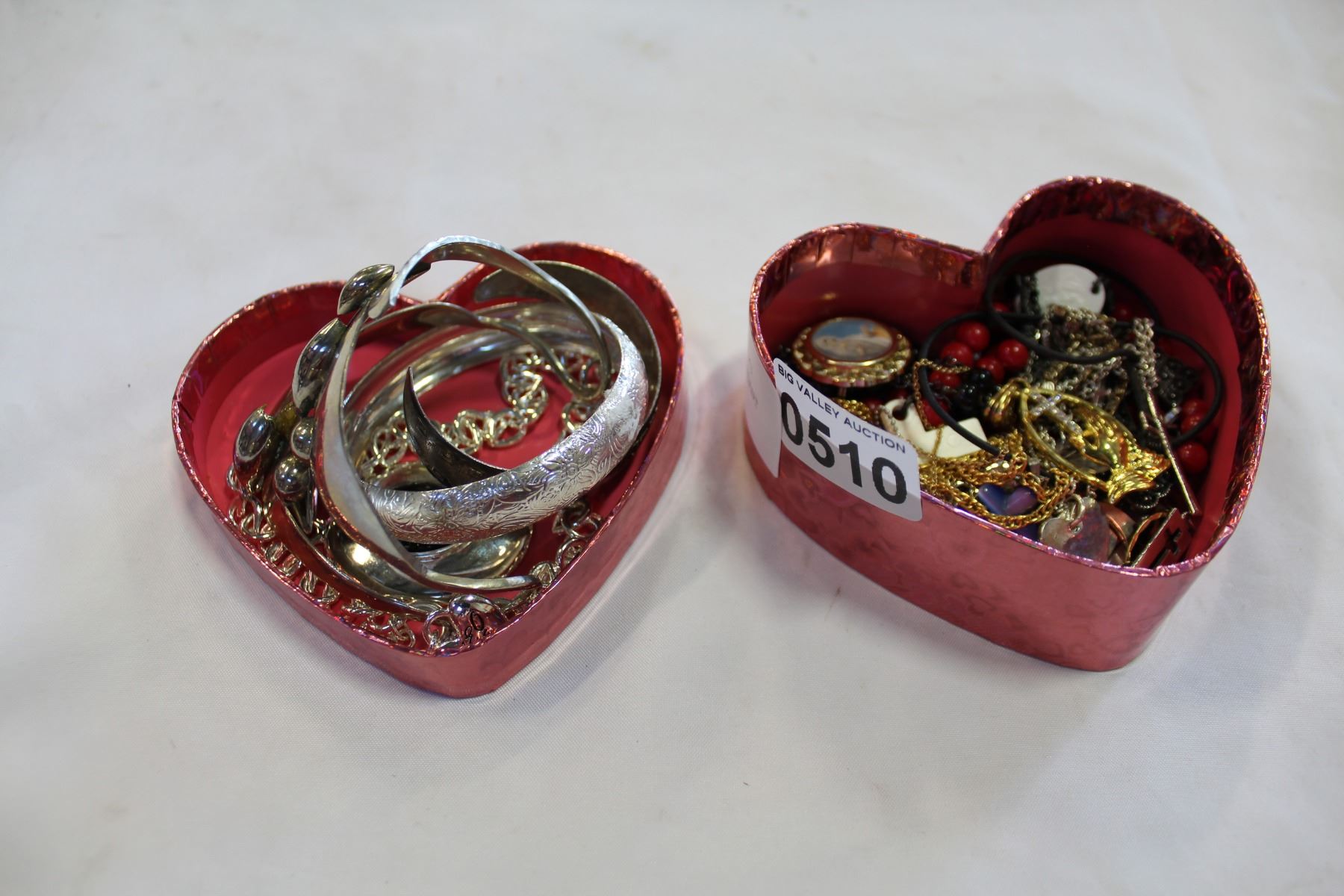 HEART BOX OF RELIGIOUS ITEMS AND BOX OF BANGLES AND PENDANT