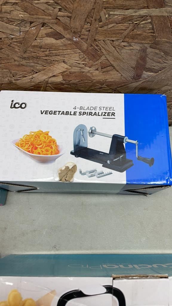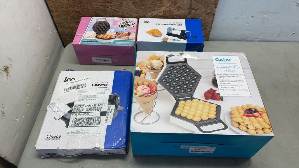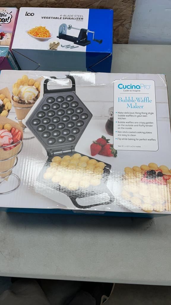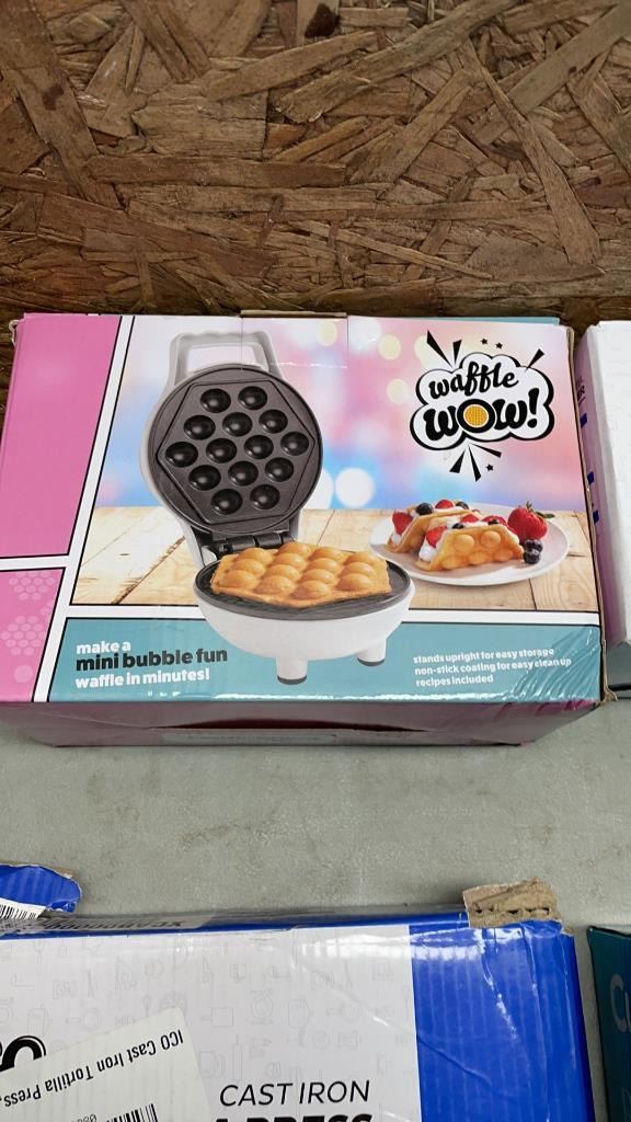 HEART WAFFLE MAKER, BUBBLE WAFFLE MAKER, VEGETABLE SPIRALIZER AND CAST IRON TORTILLA PRESS