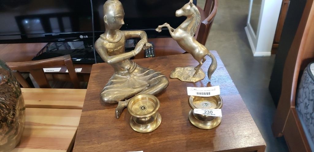 HEAVY BRASS FIGURE, TWO HEAVY BRASS CANDLESTICKS AND BRASS HORSE
