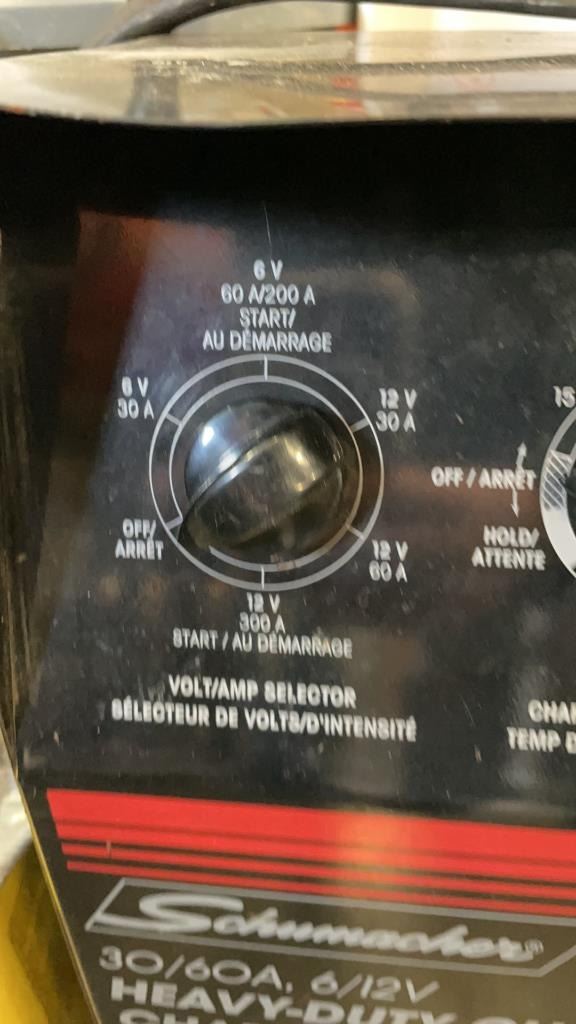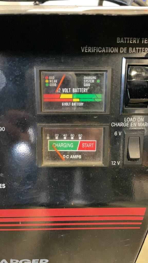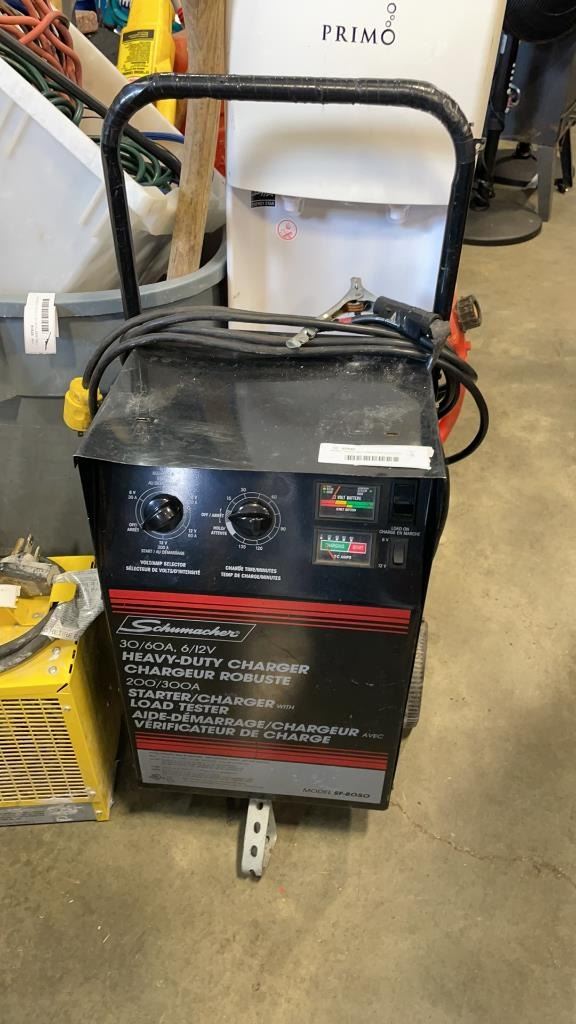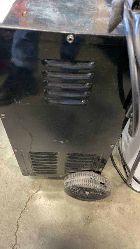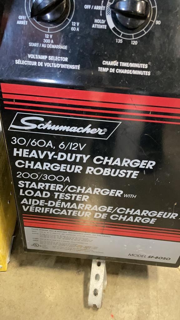 HEAVY DUTY SCHUMACHER BATTERY CHARGER/STARTER MISSING LEAD CLAMP BUT WORKING NEEDS NEW WHEELS