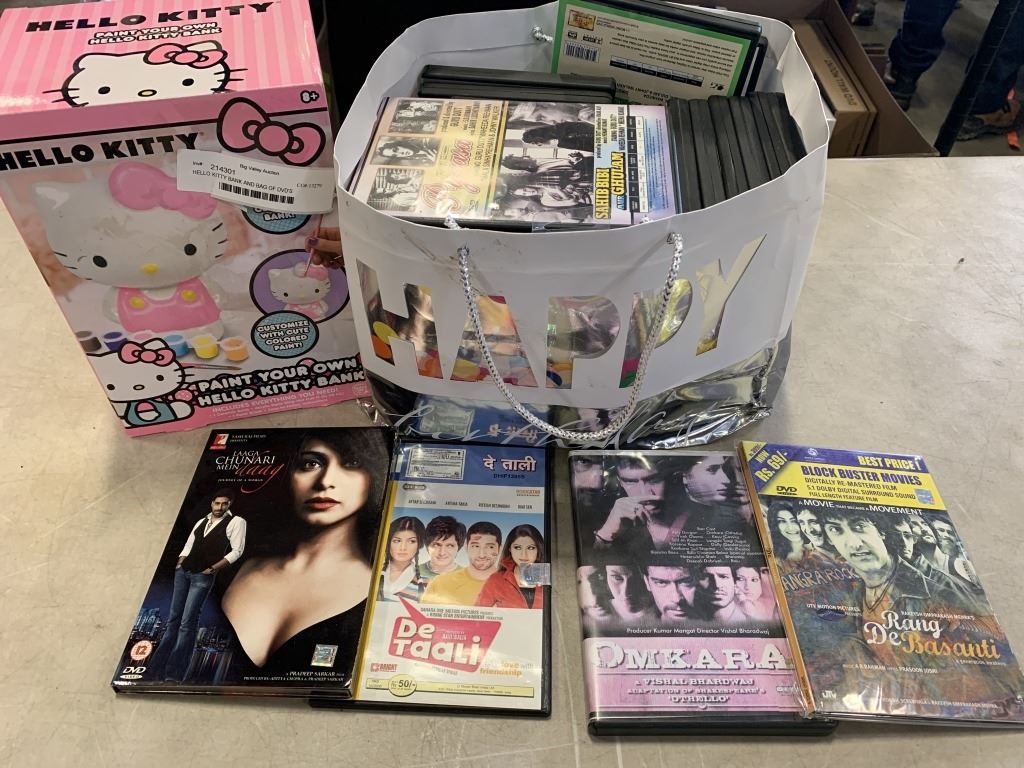 HELLO KITTY BANK AND BAG OF DVD'S