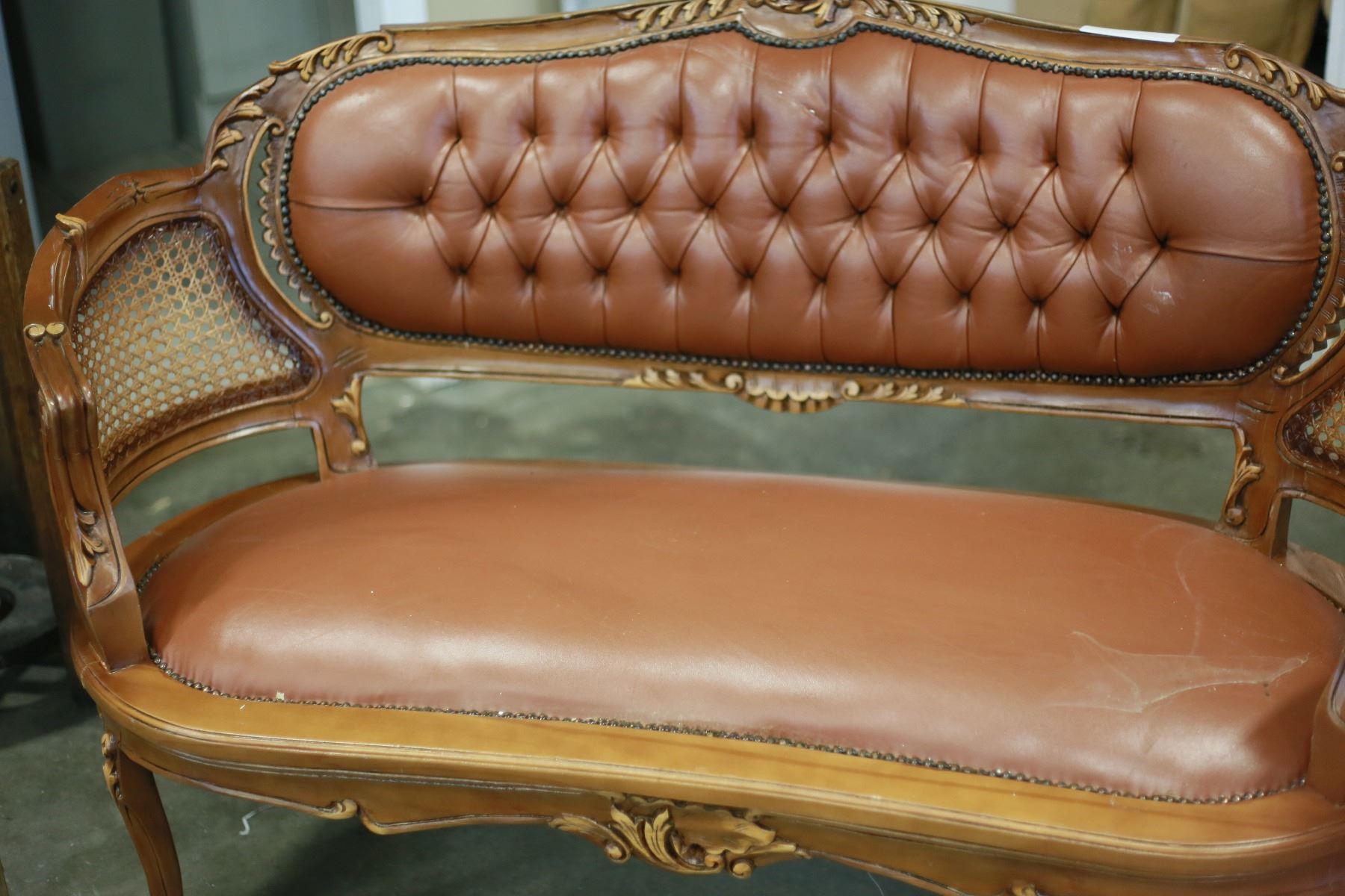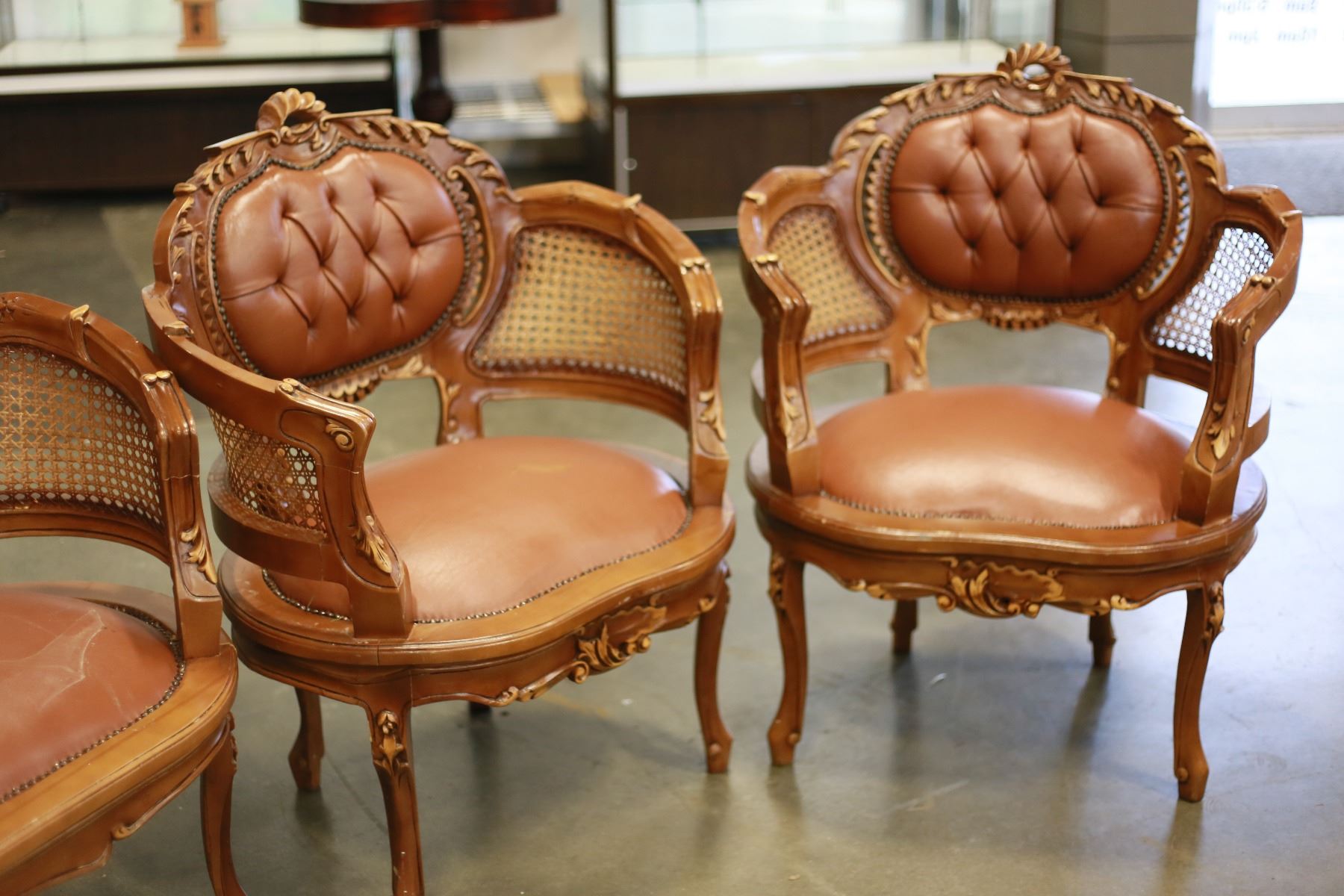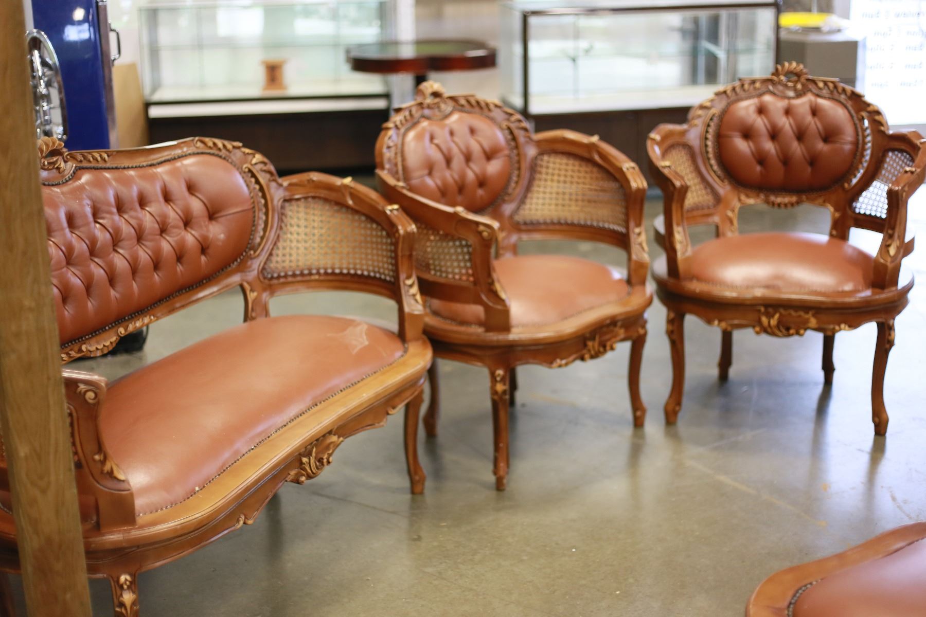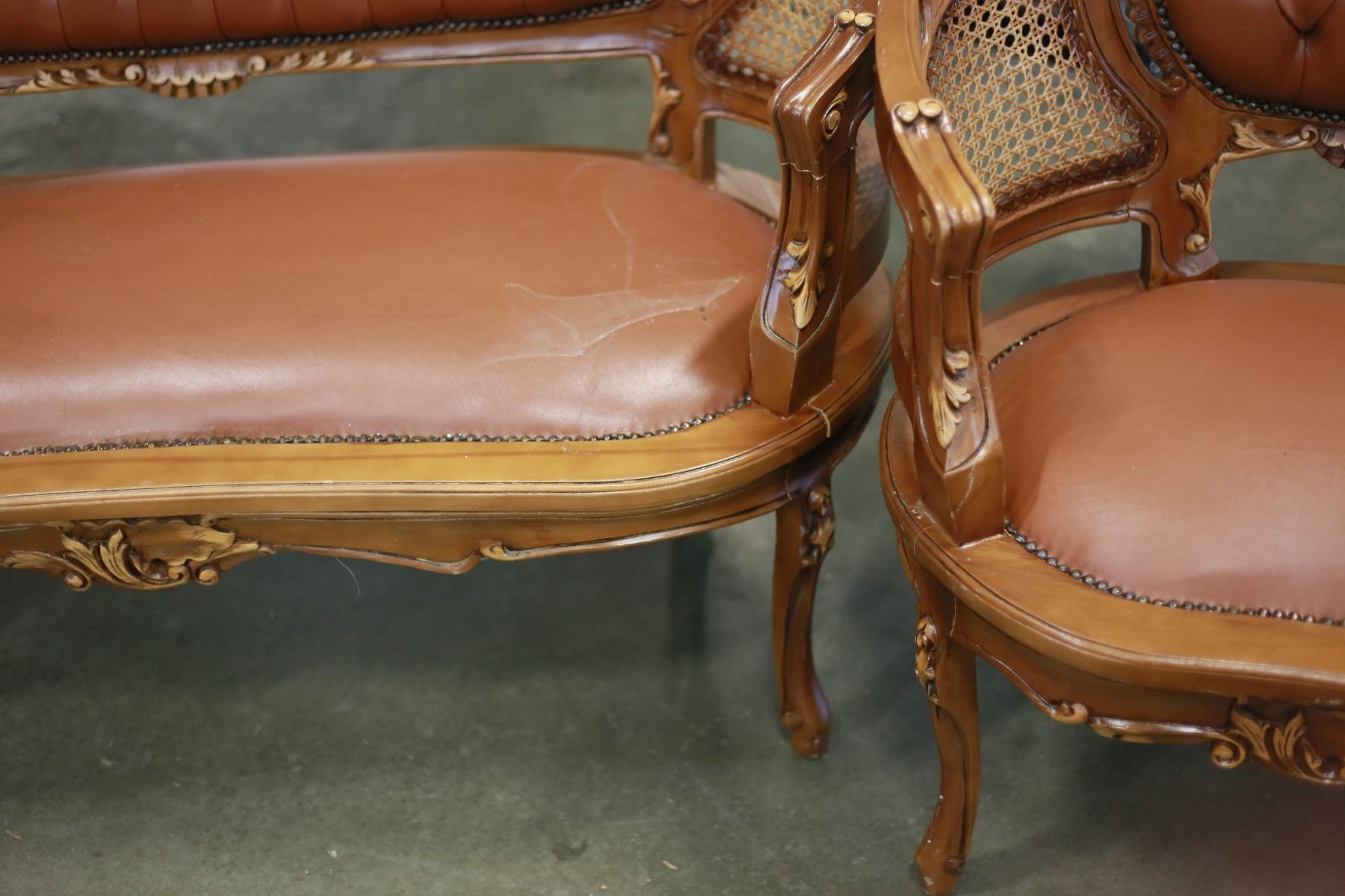 HIGHLY CARVED BROWN LEATHER BUTTON BACK SETTEE AND TWO ARMCHAIRS WITH BERGERE SIDES