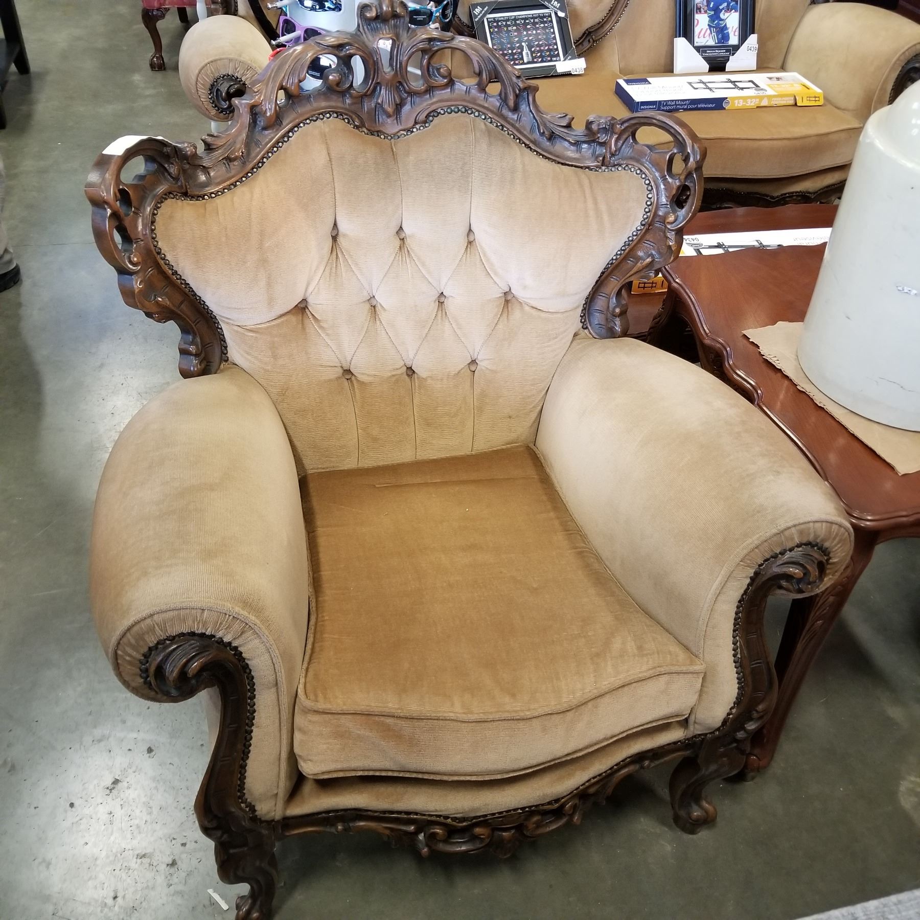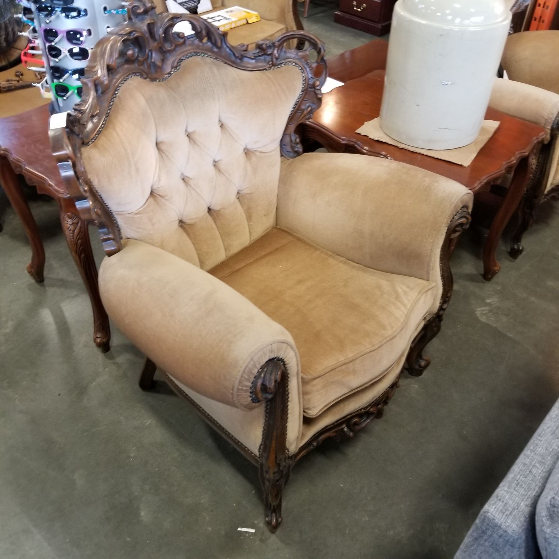 HIGHLY CARVED FRENCH PROVINCIAL ANTIQUE TUFTED ARM CHAIR