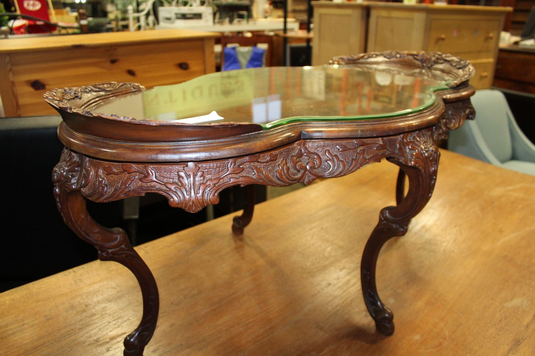 HIGHLY CARVED FRENCH STYLE COFFEE TABLE WITH SHAPED BEVELLED GLASS TOP