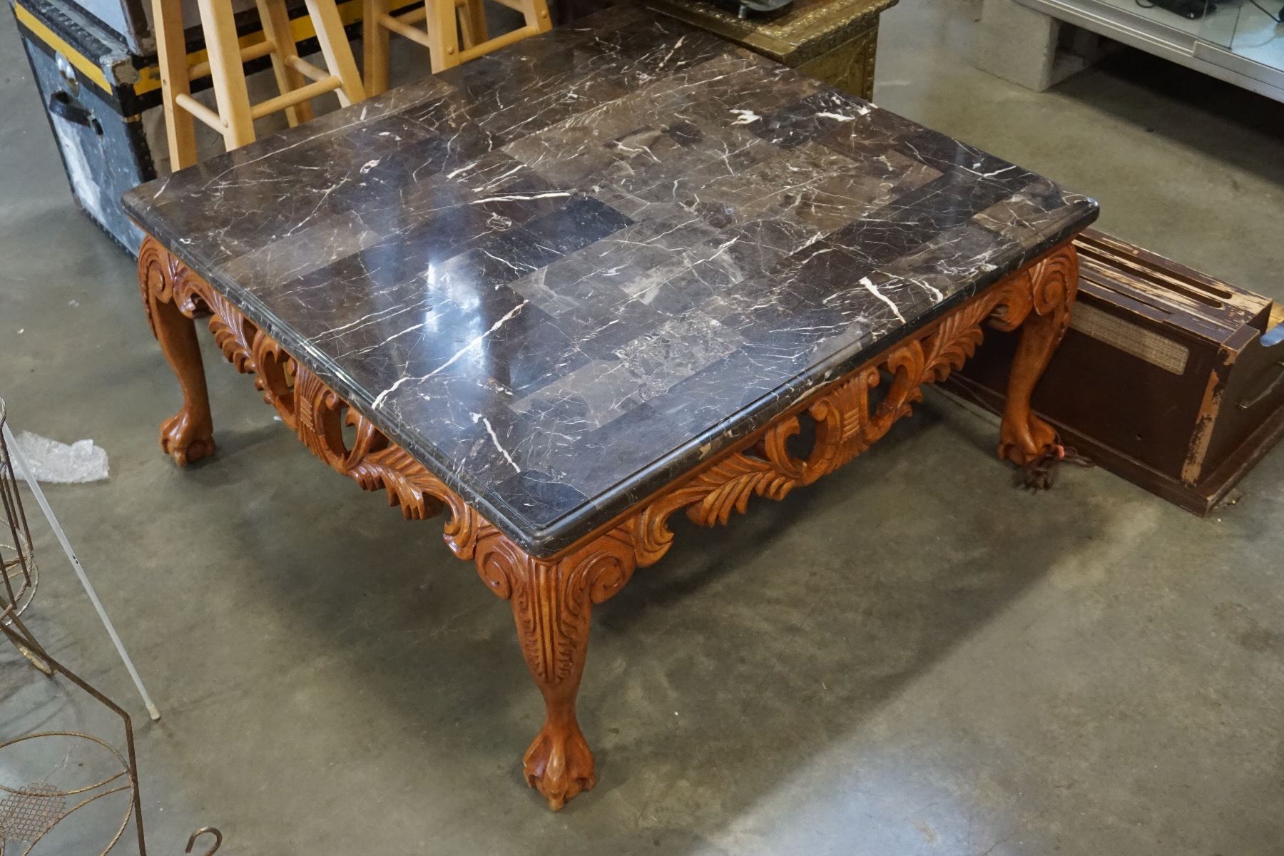 HIGHLY CARVED WOODEN CLAW FOOT COFFEE TABLE W/ MARBLE TOP