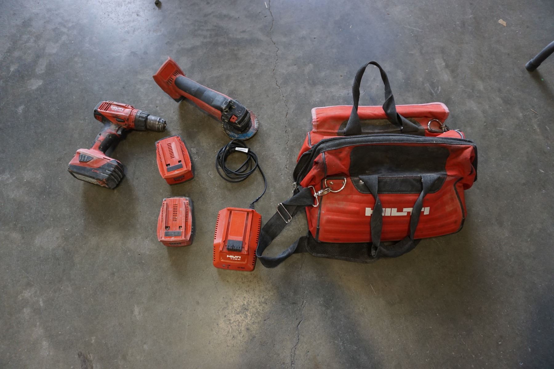 HILTI CORDLESS HAMMER DRILL, GRINDER, CHARGER, AND 3 BATTERIES - TESTED AND WORKING