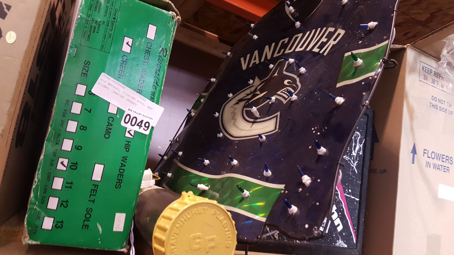 HIP WADERS, FISHING RODS, AND SIGNED CANUCKS JERSEY