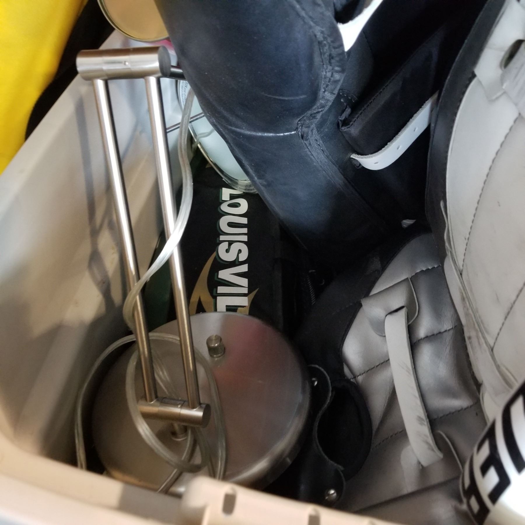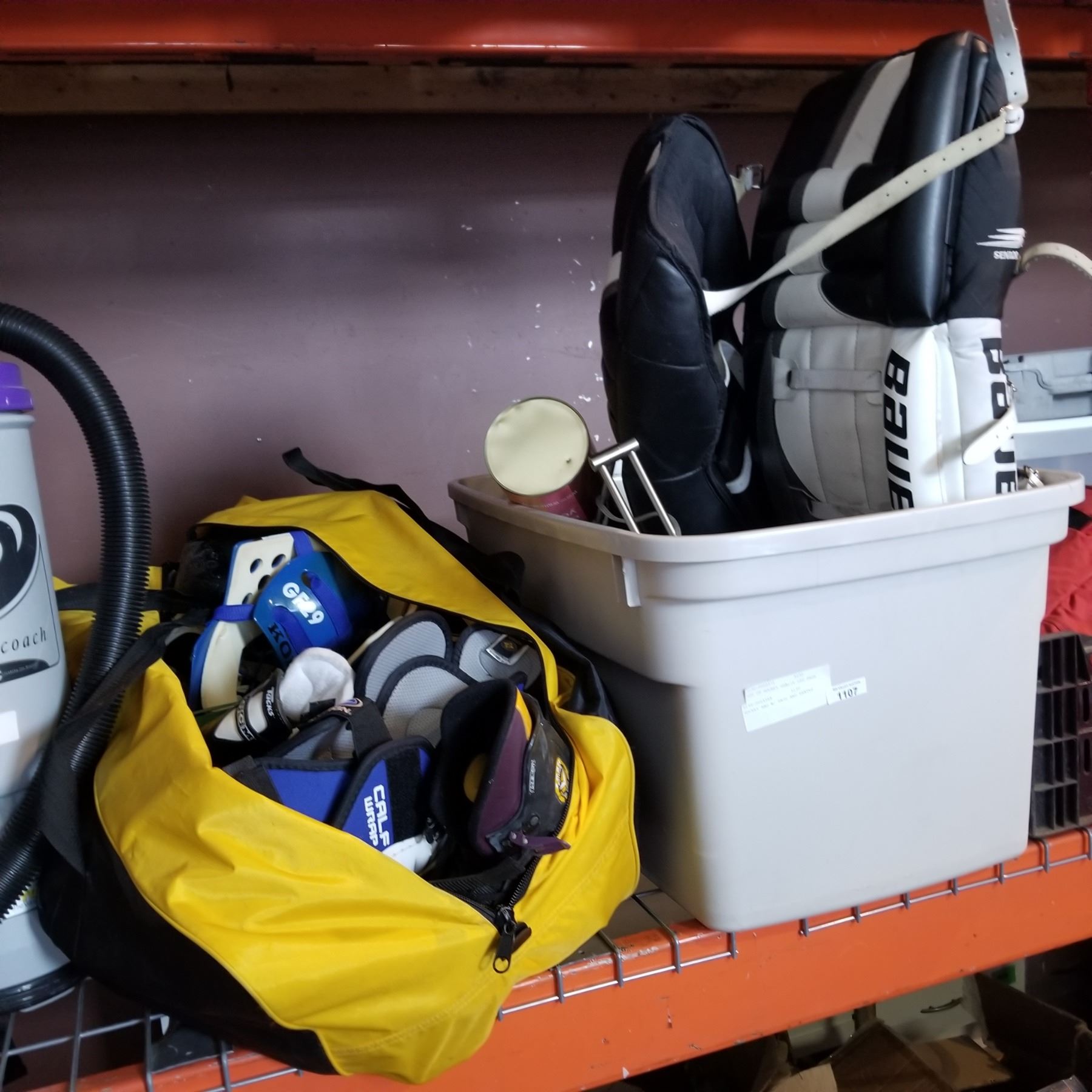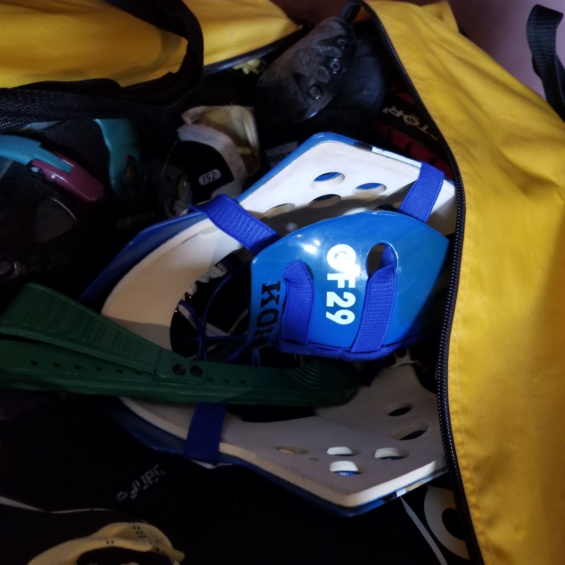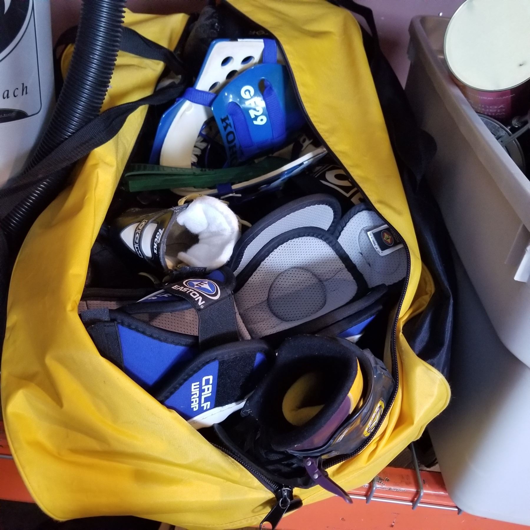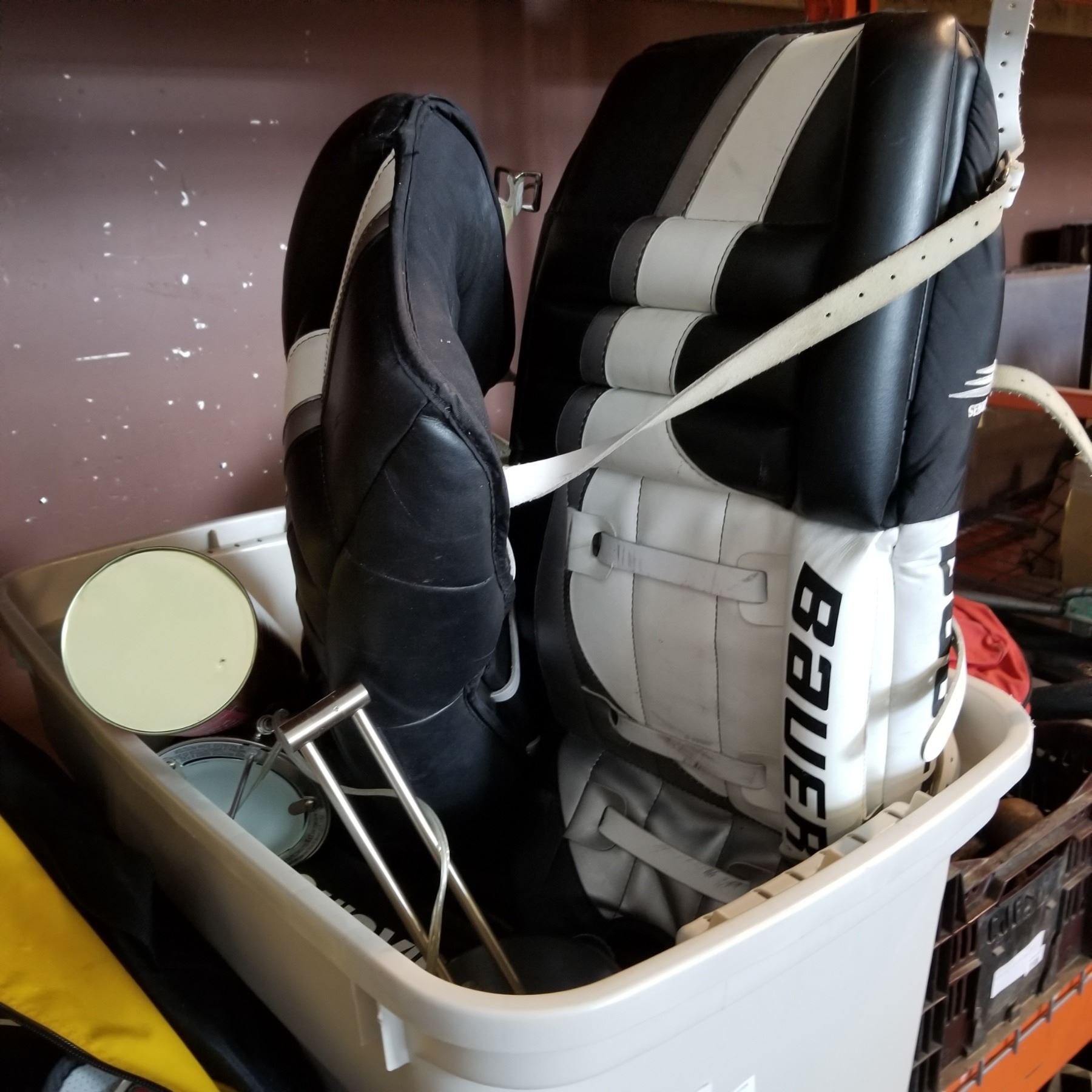 HOCKEY BAG W/ PADS AND SKATES, AND GOALIE LEG PADS
