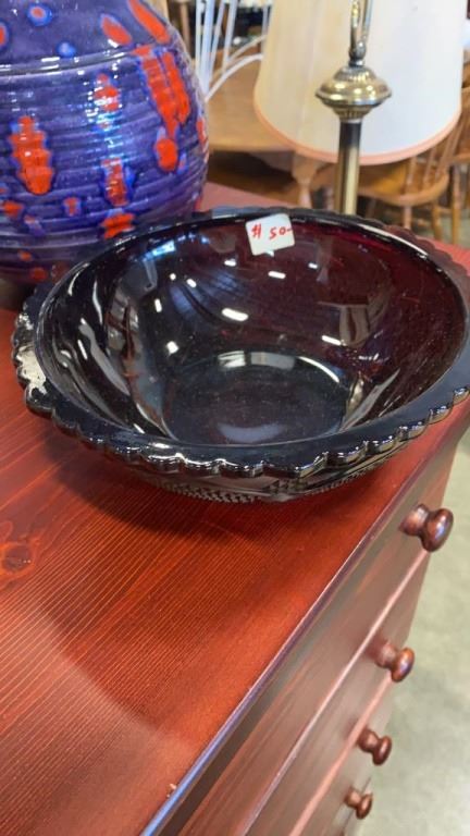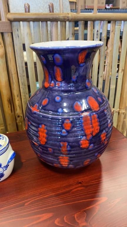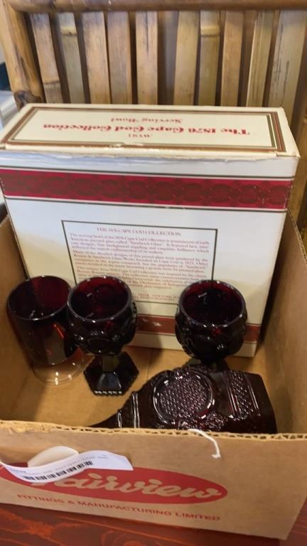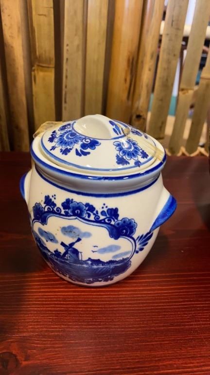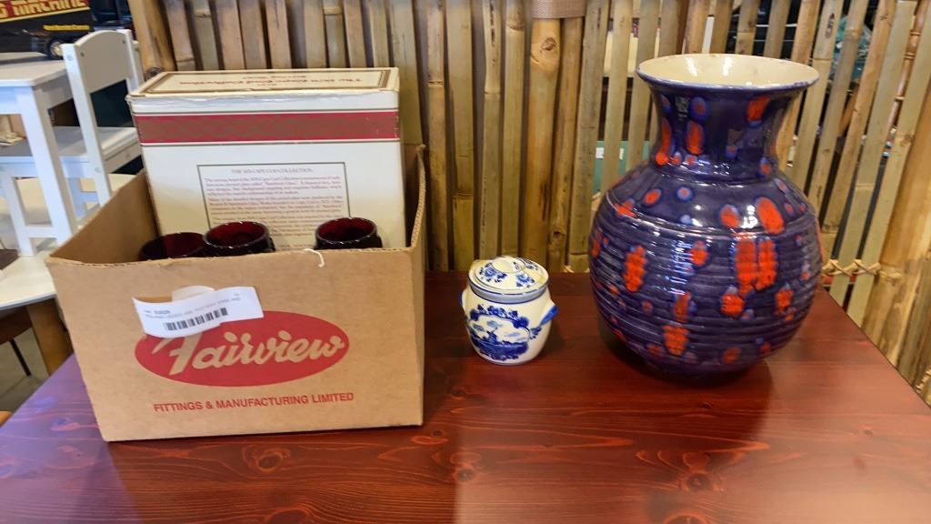 HOLLAND LIDDED JAR, POTTERY VASE AND RUBY GLASS DECANTER, CUPS AND SERVING BOWL