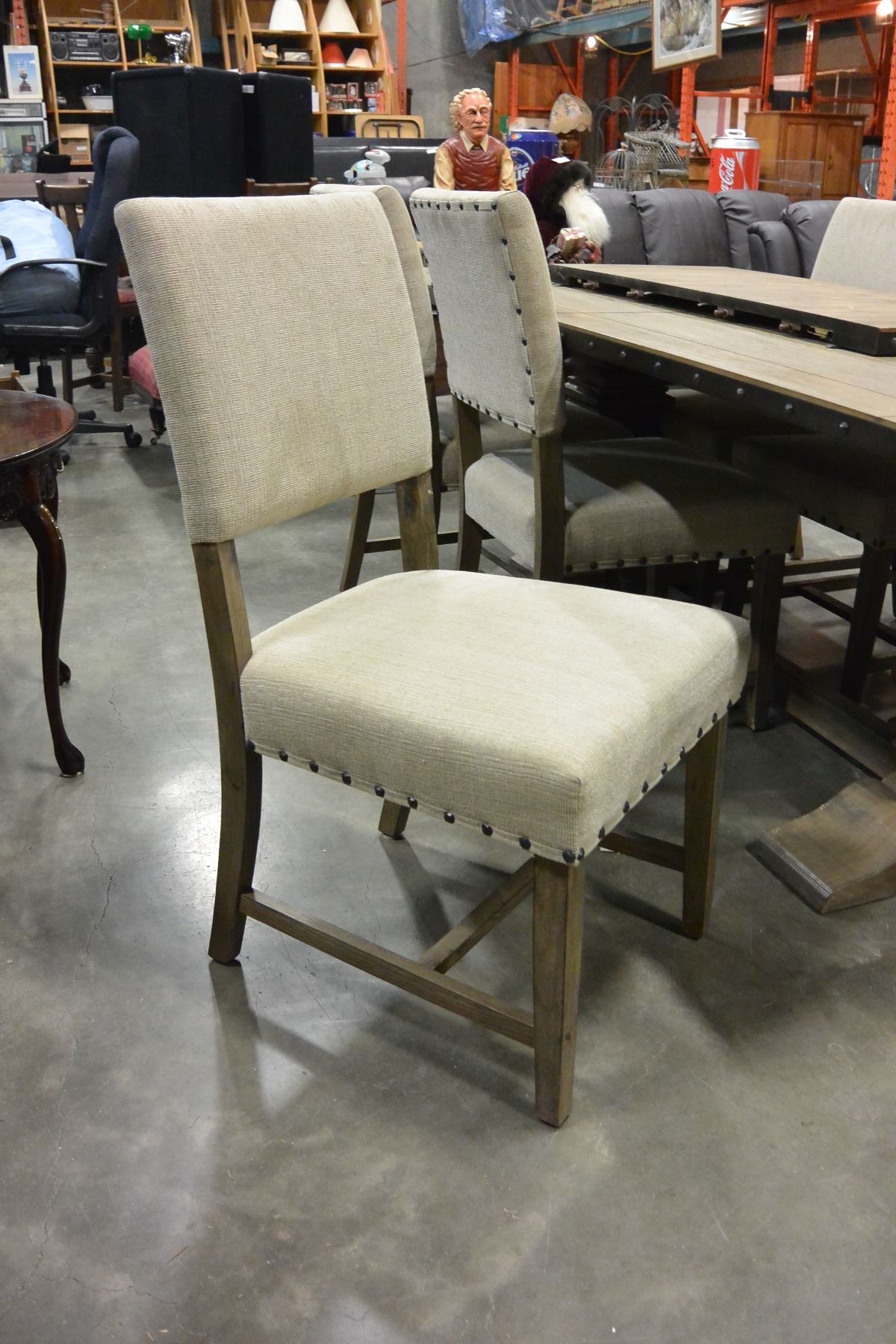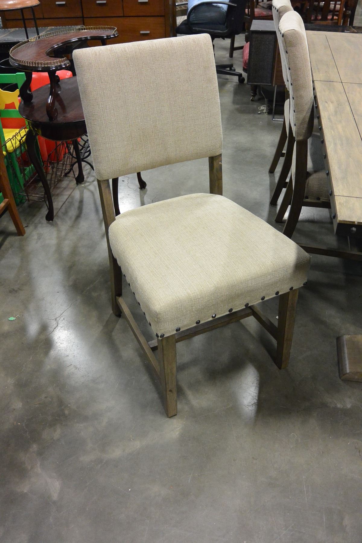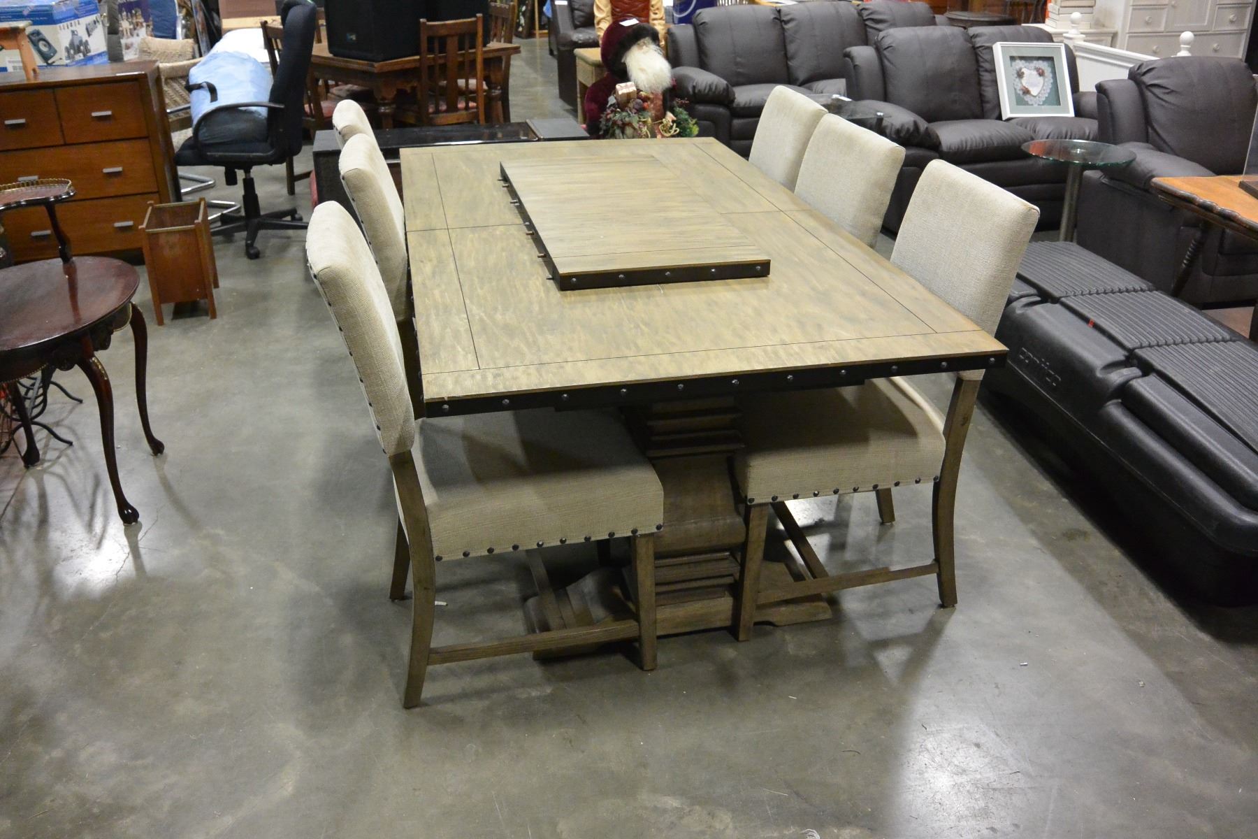 HOME ELEGANCE DINING TABLE WITH METAL BANDING AND 6 CHAIRS