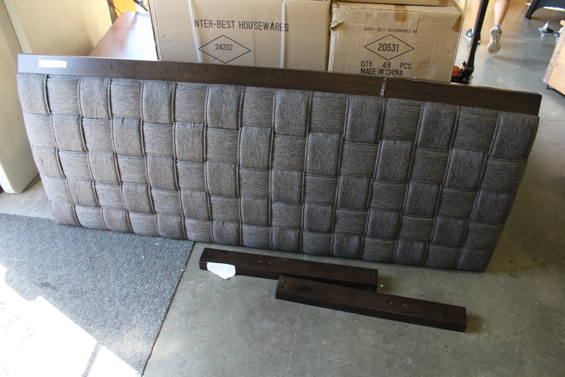 HOME ELEGANCE GREY TUFTED KINGSIZE HEADBOARD, COMES WITH LEGS, ITEM IS CRACKED ON RIGHT SIDE