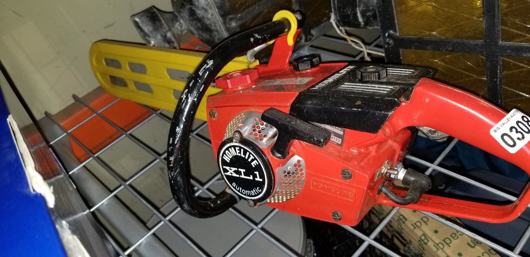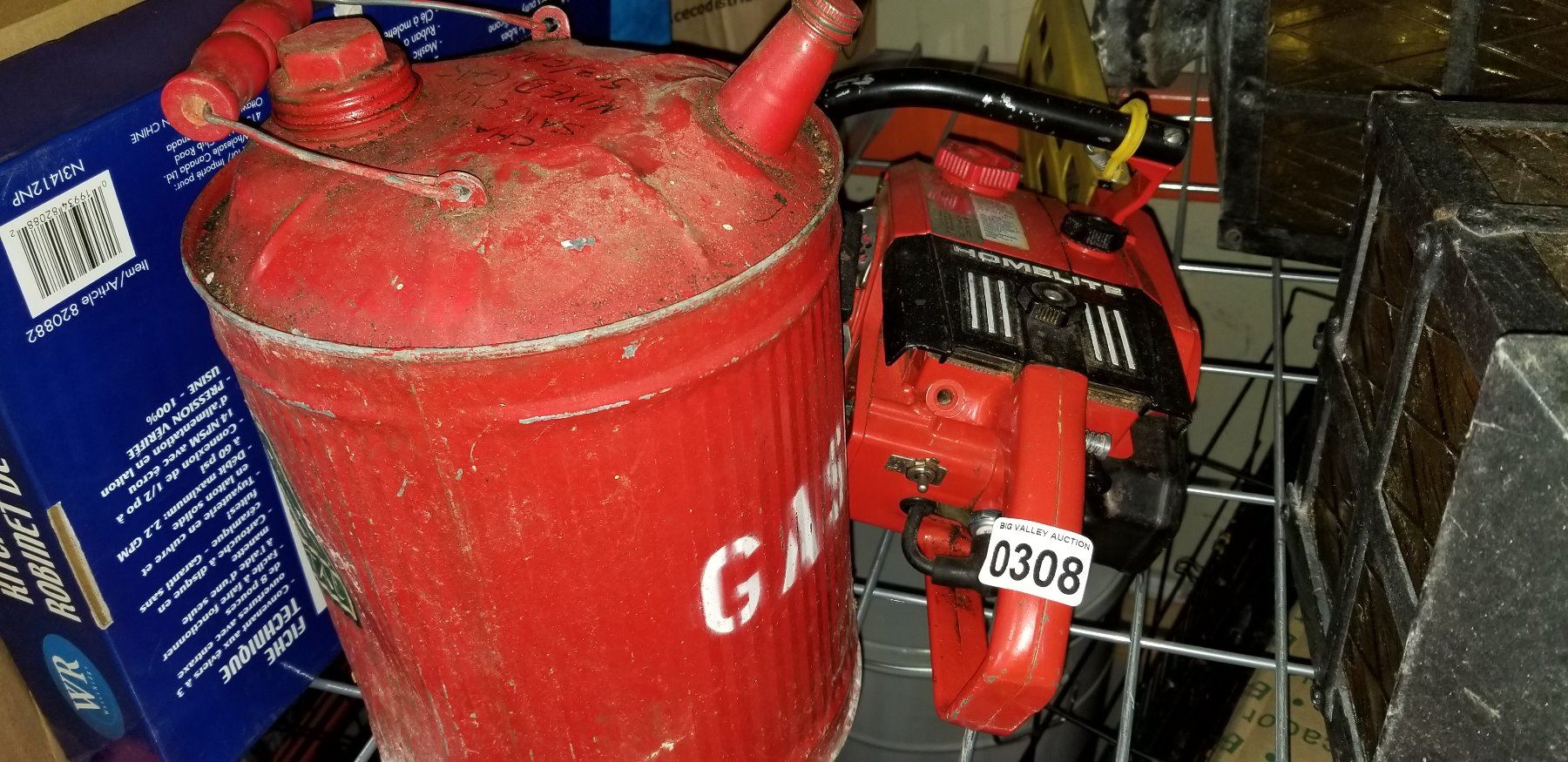 HOMELITE CHAINSAW AND METAL GAS CAN
