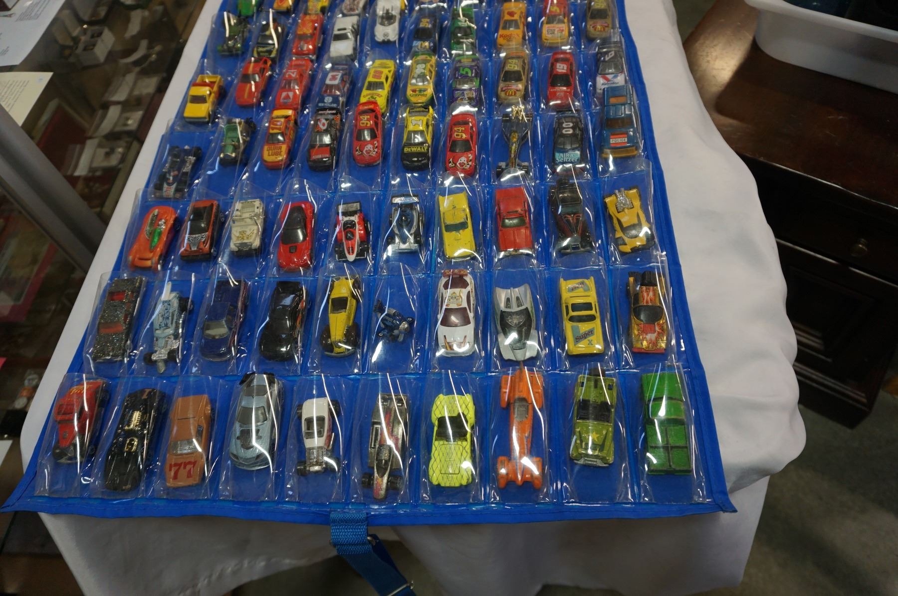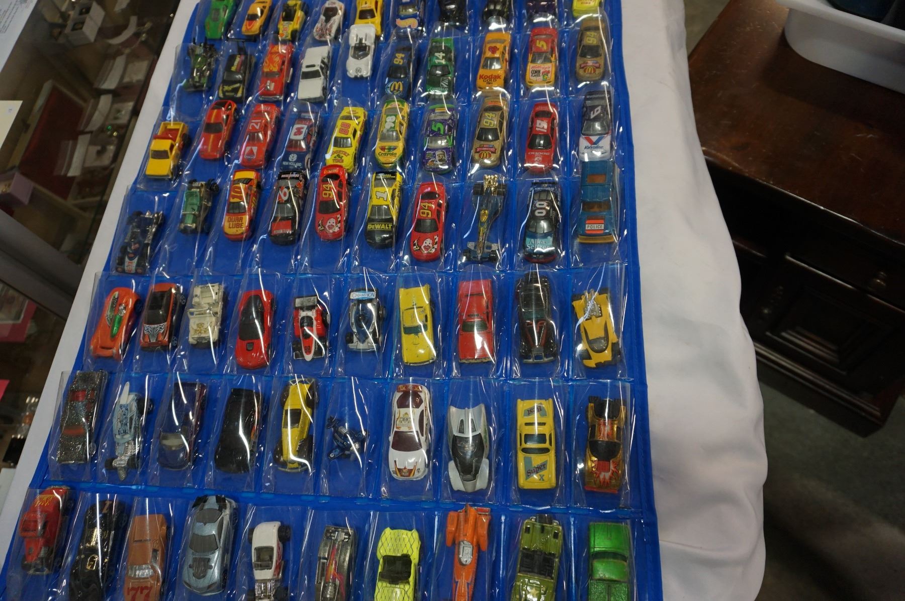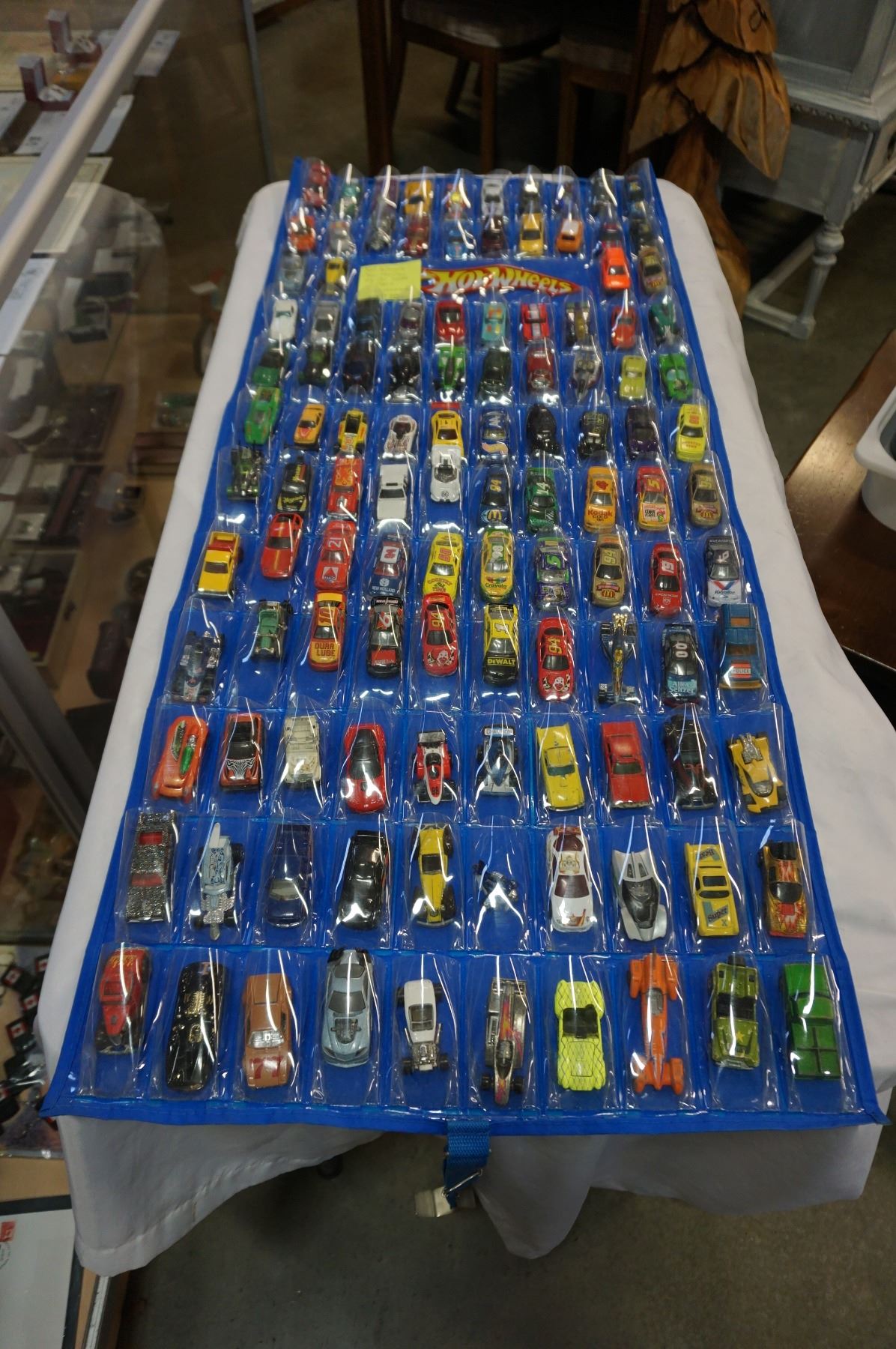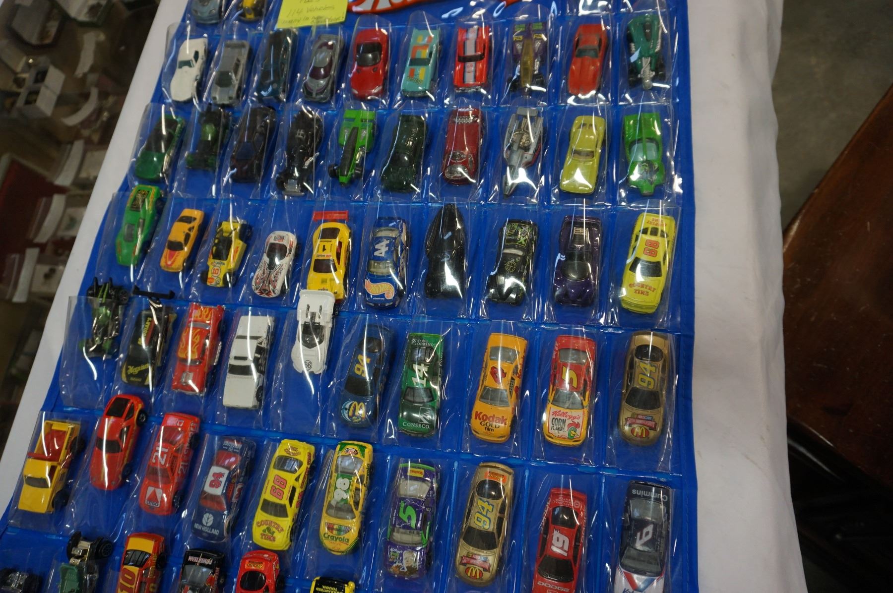 HOTWHEELS DOOR HANGER TOY CAR HOLDER WITH 114 VEHICLE, MANY IN NEW CONDITION, SOME VINTAGE