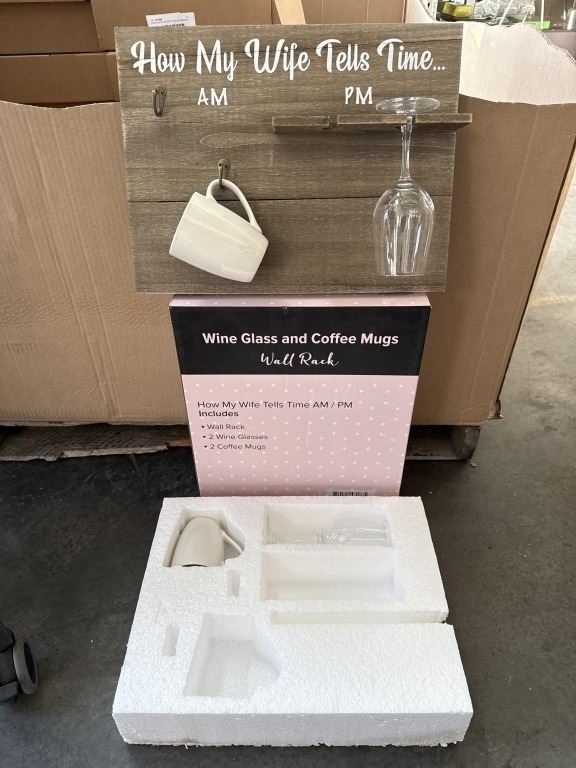 HOW MY WIFE TELLS TIME WALL RACK GIFT SET, WITH RACK, 2 WINE GLASSES AND 2 WHITE CERAMIC MUGS, ALL DISHWASHER SAFE