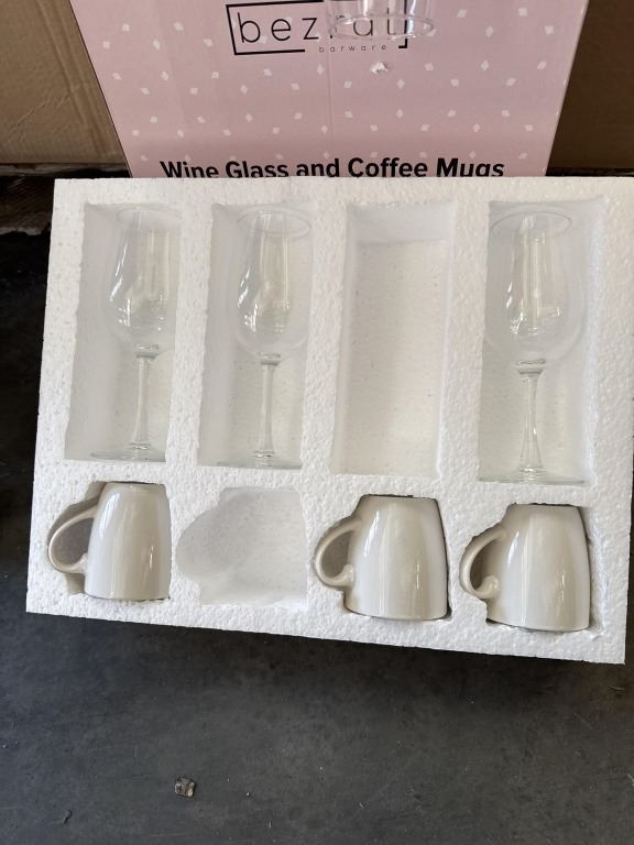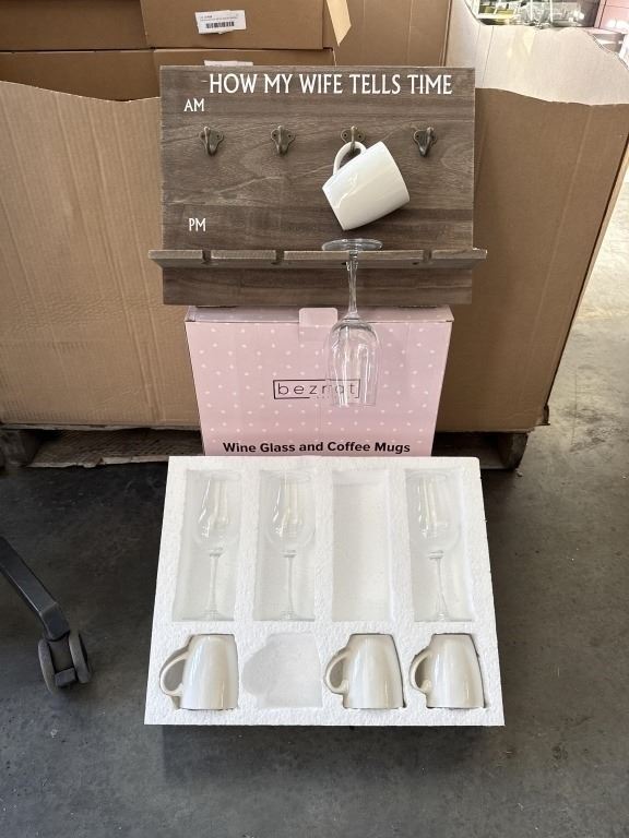 HOW MY WIFE TELLS TIME WALL RACK GIFT SET, WITH RACK, 4 WINE GLASSES AND 4 WHITE CERAMIC MUGS, ALL DISHWASHER SAFE