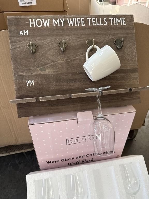 HOW MY WIFE TELLS TIME WALL RACK GIFT SET, WITH RACK, 4 WINE GLASSES AND 4 WHITE CERAMIC MUGS, ALL DISHWASHER SAFE